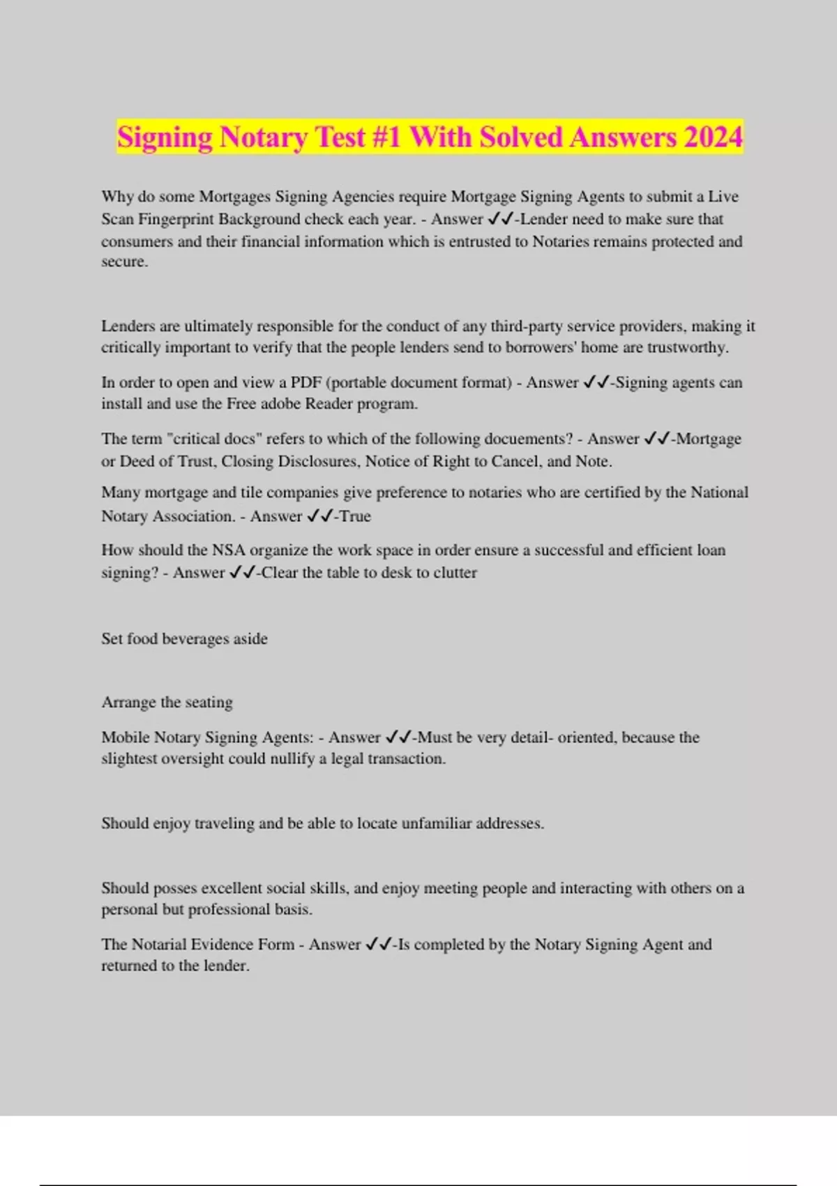 Signing Notary Test #1 With Solved Answers 2024 Why do some Mortgages Signing Agencies require Mortgage Signing Agents to submit a Live Scan Fingerprint Background check each year. - Answer ️️ -Lender need to make sure that consumers and their financial information which is entrusted to Notaries remains protected and secure. Lenders are ultimately responsible for the conduct of any third-party service providers, making it critically important to verify that the people lenders send to borrowers' home are trustworthy. In order to open and view a PDF (portable document format) - Answer ️️ -Signing agents can install and use the Free adobe Reader program. The term "critical docs" refers to which of the following docuements? - Answer ️️ -Mortgage or Deed of Trust, Closing Disclosures, Notice of Right to Cancel, and Note. Many mortgage and tile companies give preference to notaries who are certified by the National Notary Association. - Answer ️️ -True How should the NSA organize the work space in order ensure a successful and efficient loan signing? - Answer ️️ -Clear the table to desk to clutter Set food beverages aside Arrange the seating Mobile Notary Signing Agents: - Answer ️️ -Must be very detail- oriented, because the slightest oversight could nullify a legal transaction. Should enjoy traveling and be able to locate unfamiliar addresses. Should posses excellent social skills, and enjoy meeting people and interacting with others on a personal but professional basis. The Notarial Evidence Form - Answer ️️ -Is completed by the Notary Signing Agent and returned to the lender. A Mortgage Signing Agent must be able to communicate with the Signers, and and interpreter cannot be used. - Answer ️️ -True The Notarial Evidence Form is also - Answer ️️ -A record of notarization s performed in a transaction involving the purchase, or refinancing of real estate that is completed by Notary Signing Agent. Is Always required Regarding Signing Companies - Answer ️️ -They are companies that most notary signing agents are familiar with because the majority of them start out by working for them. Notary signing agents receive less money working for a signing company compared to a mortgage or title company. Working for Signing Companies allow Notary signing agents to gain experience and build a reputation for the quality of your work. A Mortgage Company - Answer ️️ -Can either be an Independent Lender or can be directly connected to the financial institution that finances mortgage loans. Usually pay the NSA more than a Signing Agency/ Company Which of the following types of companies employ Notary Signing Agents? - Answer ️️ - Mortgages Companies Title Companies Signing Companies Why does the lender need the IRS Form W-9? - Answer ️️ -To verify the borrower's taxpayer ID number New Notary Signing Agents generally work for Signing Agencies / Companies - Answer ️️ - Because, they do not have any solid experience and also do not have reputation in the field yet. Because , Mortgage and Title companies usually only deal with experience and knowledgeable notaries who have a reputation for dependability and a high level of knowledge in the industry. Because, unless they personally know someone in the Mortgage/ Title industry, it is extremely difficult to get assignments. Approaching Mortgage and Title companies at this stage could risk ruining their reputation in the industry when errors occur. The National Notary Association is a private company - Answer ️️ -True