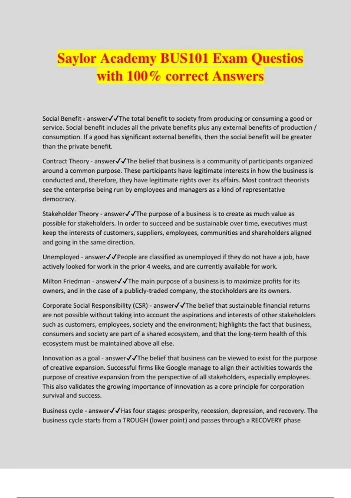 Saylor Academy BUS101 Exam Questios with 100% correct Answers Social Benefit - answerThe total benefit to society from producing or consuming a good or service. Social benefit includes all the private benefits plus any external benefits of production / consumption. If a good has significant external benefits, then the social benefit will be greater than the private benefit. Contract Theory - answerThe belief that business is a community of participants organized around a common purpose. These participants have legitimate interests in how the business is conducted and, therefore, they have legitimate rights over its affairs. Most contract theorists see the enterprise being run by employees and managers as a kind of representative democracy. Stakeholder Theory - answerThe purpose of a business is to create as much value as possible for stakeholders. In order to succeed and be sustainable over time, executives must keep the interests of customers, suppliers, employees, communities and shareholders aligned and going in the same direction. Unemployed - answerPeople are classified as unemployed if they do not have a job, have actively looked for work in the prior 4 weeks, and are currently available for work. Milton Friedman - answerThe main purpose of a business is to maximize profits for its owners, and in the case of a publicly-traded company, the stockholders are its owners. Corporate Social Responsibility (CSR) - answerThe belief that sustainable financial returns are not possible without taking into account the aspirations and interests of other stakeholders such as customers, employees, society and the environment; highlights the fact that business, consumers and society are part of a shared ecosystem, and that the long-term health of this ecosystem must be maintained above all else. Innovation as a goal - answerThe belief that business can be viewed to exist for the purpose of creative expansion. Successful firms like Google manage to align their activities towards the purpose of creative expansion from the perspective of all stakeholders, especially employees. This also validates the growing importance of innovation as a core principle for corporation survival and success. Business cycle - answerHas four stages: prosperity, recession, depression, and recovery. The business cycle starts from a TROUGH (lower point) and passes through a RECOVERY phase followed by a period of expansion (upper turning point) and PROSPERITY. After the PEAK point is reached there is a declining phase of RECESSION followed by a DEPRESSION. Prosperity - answerHighest level of the recovery phase of the business cycle. Marked by an expansion of output, income, employment, prices and profits, a rise in the standard of living, rising interest rates, inflation, and a large expansion of bank credit. Due to a high level of economic activity, it causes a rise in prices and profits. There is an upswing in the economic activity and economy reaches its PEAK. Recession - answerWhen a broad range of economic indicators falls for at least 6 months; the turning point from prosperity to depression. Economic activities slow down and demand starts falling. There is a steady decline in output, income, employment, prices and profits. Businessmen lose confidence and become pessimistic. Investment is reduced and bank credit contracts. Business expansion stops, stock market falls, orders are cancelled, and people start losing their jobs. The increase in unemployment causes a sharp decline in income and demand. Generally, recession lasts for a short period. Depression - answerDepression sets in when there is a continuous decrease of output, income, employment, prices and profits causing a fall in the standard of living. Marked by a fall in income, decline in consumption and demand, rise in unemployment, fall in interest rates, contraction of bank credit and overall business pessimism. Economic activity is at the lowest, and prices and profits decline until the economy reaches its TROUGH (low point) Recovery - answerThe turning point from depression to prosperity. Marked by a rise in economic activity. There is a steady rise in demand, output, production, employment, and income. Prices and profits increase. Businesses become optimistic. Investments increase. Banks expand credit, business expansion takes place and stock markets are activated. Recovery slowly emerges into prosperity, and the business cycle is repeated. Inflation - answerWhen goods and services are in high demand, creating a drop in availability. Consumers are willing to pay more for the items they want, causing manufacturers and service providers to charge more. Inflation is calculated as a percentage change in CPI. Deflation - answerOccurs when too many goods are available or when there is not enough money circulating to purchase those goods. For example, if a particular type of car becomes hig