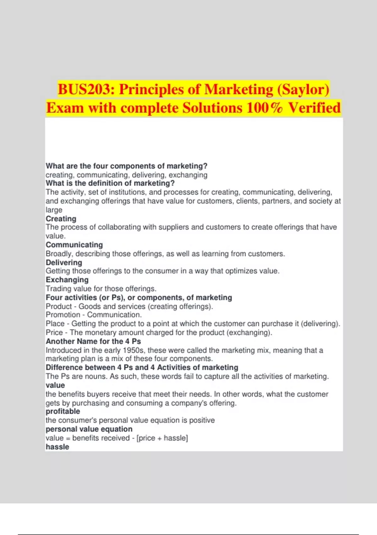 BUS203: Principles of Marketing (Saylor) Exam with complete Solutions 100% Verified What are the four components of marketing? creating, communicating, delivering, exchanging What is the definition of marketing? The activity, set of institutions, and processes for creating, communicating, delivering, and exchanging offerings that have value for customers, clients, partners, and society at large Creating The process of collaborating with suppliers and customers to create offerings that have value. Communicating Broadly, describing those offerings, as well as learning from customers. Delivering Getting those offerings to the consumer in a way that optimizes value. Exchanging Trading value for those offerings. Four activities (or Ps), or components, of marketing Product - Goods and services (creating offerings). Promotion - Communication. Place - Getting the product to a point at which the customer can purchase it (delivering). Price - The monetary amount charged for the product (exchanging). Another Name for the 4 Ps Introduced in the early 1950s, these were called the marketing mix, meaning that a marketing plan is a mix of these four components. Difference between 4 Ps and 4 Activities of marketing The Ps are nouns. As such, these words fail to capture all the activities of marketing. value the benefits buyers receive that meet their needs. In other words, what the customer gets by purchasing and consuming a company's offering. profitable the consumer's personal value equation is positive personal value equation value = benefits received - [price + hassle] hassle the time and effort the consumer puts into the shopping process. The marketing concept a philosophy underlying all that marketers do, requires that marketers seek to satisfy customer wants and needs. market oriented Firms operating with the marketing concept philosophy production orientation Beginning with the Industrial Revolution in the late 1800s, companies believed that the best way to compete was by reducing production costs. Example of production orientation Henry Ford's Model A automobile, the first product of his production line innovation. Ford's production line made the automobile cheap and affordable for just about everyone. Production Era lasted until the 1920s, when production-capacity growth began to outpace demand growth and new strategies were called for. There are, however, companies that still focus on production as the way to compete. selling orientation From the 1920s until after World War II, companies believed it was necessary to push their products by heavily emphasizing advertising and selling. Consumers during the Great Depression and World War II did not have as much money, so the competition for their available dollars was stiff. Selling Era The result of the selling orientation. Companies like the Fuller Brush Company and Hoover Vacuum began selling door-to-door and the vacuum-cleaner salesman (they were always men) was created. Just as with production, some companies still operate with a push focus. Product Orientation focus on product innovation Marketing Era After WWII, businesses began to develop brands to help consumers understand the differences among products value era a time when companies emphasize creating value for customers. one-to-one era meaning that the way to compete is to build relationships with customers one at a time and seek to serve each customer's needs individually. Modern business era value era or one-to-one era, or service dominant logic era Service Dominant Logic An approach to business that recognizes that customers do not distinguish between the tangible and the intangible aspects of a good or service, but rather see a product in terms of its total value. offering The entire bundle consisting of the tangible good, the intangible service, and the price supply chain includes a number of organizations and functions that mine, make, assemble, or deliver materials and products from a manufacturer to consumers. The actual group of organizations can vary greatly from industry to industry, and include wholesalers, transportation companies, and retailers. Logistics the actual transportation and storage of materials and products, is the primary component of supply chain management, but there are other aspects of supply chain management that we will discuss later. exchange the actual transaction social marketing Marketing conducted in an effort to achieve certain social objectives can be done by government agencies, nonprofit institutions, religious organizations, and others. What types of companies engage in marketing? For-profit organizations, nonprofit organizations, government entities, and individuals What is the difference between nonprofit