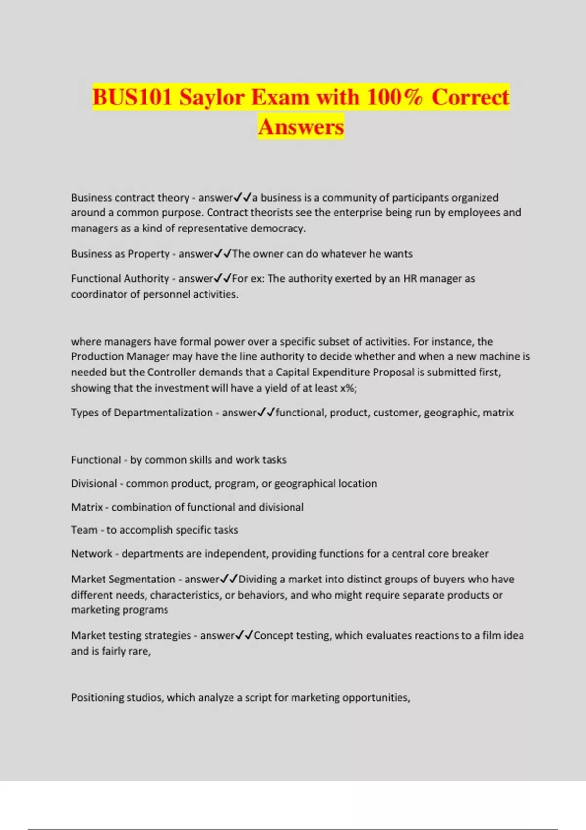 BUS101 Saylor Exam with 100% Correct Answers Business contract theory - answera business is a community of participants organized around a common purpose. Contract theorists see the enterprise being run by employees and managers as a kind of representative democracy. Business as Property - answerThe owner can do whatever he wants Functional Authority - answerFor ex: The authority exerted by an HR manager as coordinator of personnel activities. where managers have formal power over a specific subset of activities. For instance, the Production Manager may have the line authority to decide whether and when a new machine is needed but the Controller demands that a Capital Expenditure Proposal is submitted first, showing that the investment will have a yield of at least x%; Types of Departmentalization - answerfunctional, product, customer, geographic, matrix Functional - by common skills and work tasks Divisional - common product, program, or geographical location Matrix - combination of functional and divisional Team - to accomplish specific tasks Network - departments are independent, providing functions for a central core breaker Market Segmentation - answerDividing a market into distinct groups of buyers who have different needs, characteristics, or behaviors, and who might require separate products or marketing programs Market testing strategies - answerConcept testing, which evaluates reactions to a film idea and is fairly rare, Positioning studios, which analyze a script for marketing opportunities, Focus groups, which probe viewers' opinions about a film in small groups prior to release, Test screenings, which involve the previewing of films prior to theatrical release, Tracking studies, which gauge (often by telephone polling) an audience's awareness of a film on a weekly basis prior to and during theatrical release, Advertising testing, which measures responses to marketing materials such as trailers and television advertisements, Exit surveys, which measure audience reactions after seeing the film in the cinema. Normal vs Economic Profit - answerNormal profit represents the total opportunity costs (both explicit and implicit) of a venture to an investor, whereas economic profit is the difference between a firm's total revenue and all costs (including normal profit). Game theory Evolutionary stable strategy - answer profit maximization chart - answer Double Bottom Line - answerseeks to extend the conventional bottom line, that measures fiscal performance— financial profit or loss— by adding a second bottom line to measure their performance in terms of positive social impact Stakeholder Theorists - answerbelieve that people who have legitimate interests in a business also ought to have voice in how the business is run. However, stakeholder theorists take contract theory a step further, maintaining that people outside of the business enterprise ought to have a say in how the business operates. Thus, for example, consumers, even community members who could be affected by what the business does (for example, by the pollutants of a factory) ought to have some control over the business. economic value - answerworth of a good or service as determined by the market consumer surplus - answerthe amount a buyer is willing to pay for a good minus the amount the buyer actually pays