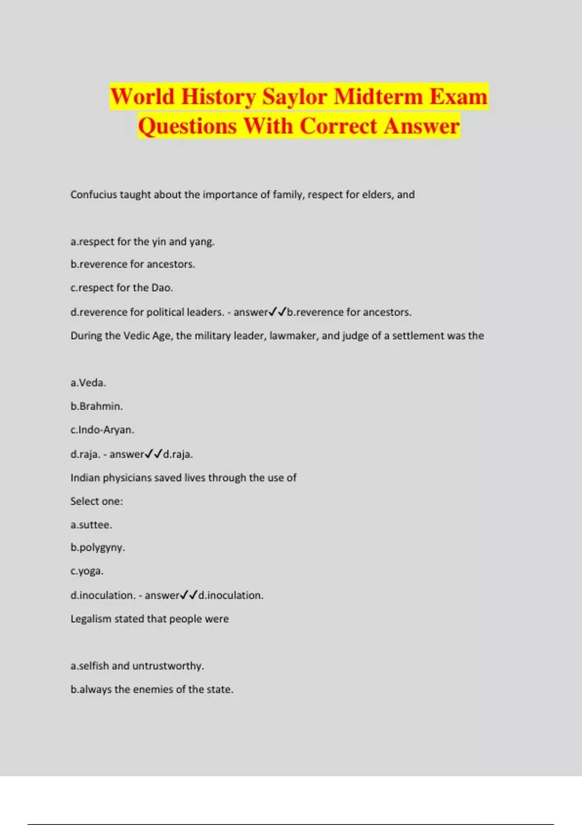 World History Saylor Midterm Exam Questions With Correct Answer Confucius taught about the importance of family, respect for elders, and ct for the yin and yang. ence for ancestors. ct for the Dao. ence for political leaders. - answerence for ancestors. During the Vedic Age, the military leader, lawmaker, and judge of a settlement was the a.Veda. b.Brahmin. c.Indo-Aryan. . - answer. Indian physicians saved lives through the use of Select one: e. yny. . lation. - answerlation. Legalism stated that people were sh and untrustworthy. s the enemies of the state. al leaders. ally virtuous. - answersh and untrustworthy. Mahayana Buddhists viewed the Buddha as a(n) r. sion of Hinduism. et . - answerr. More people became Buddhists after a.India became part of the Persian empire. Mauryans traded with Buddhist countries. c.Ásoka's conversion. d.Chandra Gupta's conversion. - answerc.Ásoka's conversion. One of the reasons for discontent among the people under the Qin dynasty was de invaders. flood management of the Huang. d labor. leadership. - answerd labor. One reason the Guptas lost power was because they ded too quickly. priests become too powerful. rted to Buddhism. local leaders become too powerful. - answer local leaders become too powerful. Pariahs were s of Indo-Aryan settlements. highest part of the caste system. lowest part of the caste system. de of the caste system. - answerde of the caste system. Right Action is of the Eightfold Path. of the Vedas. epic poem. of the Four Noble Truths. - answer of the Eightfold Path. Siddhartha Gautama became known as the a.Buddha. b.Great Renunciator. c.Way of Life. d.Brahmin. - answera.Buddha. The Buddha taught that the way to salvation was of human hands. b.a life of selflessness. ence to your caste. d.a life of Brahmin worship. - answerb.a life of selflessness. The Chinese built dikes along the bank of the