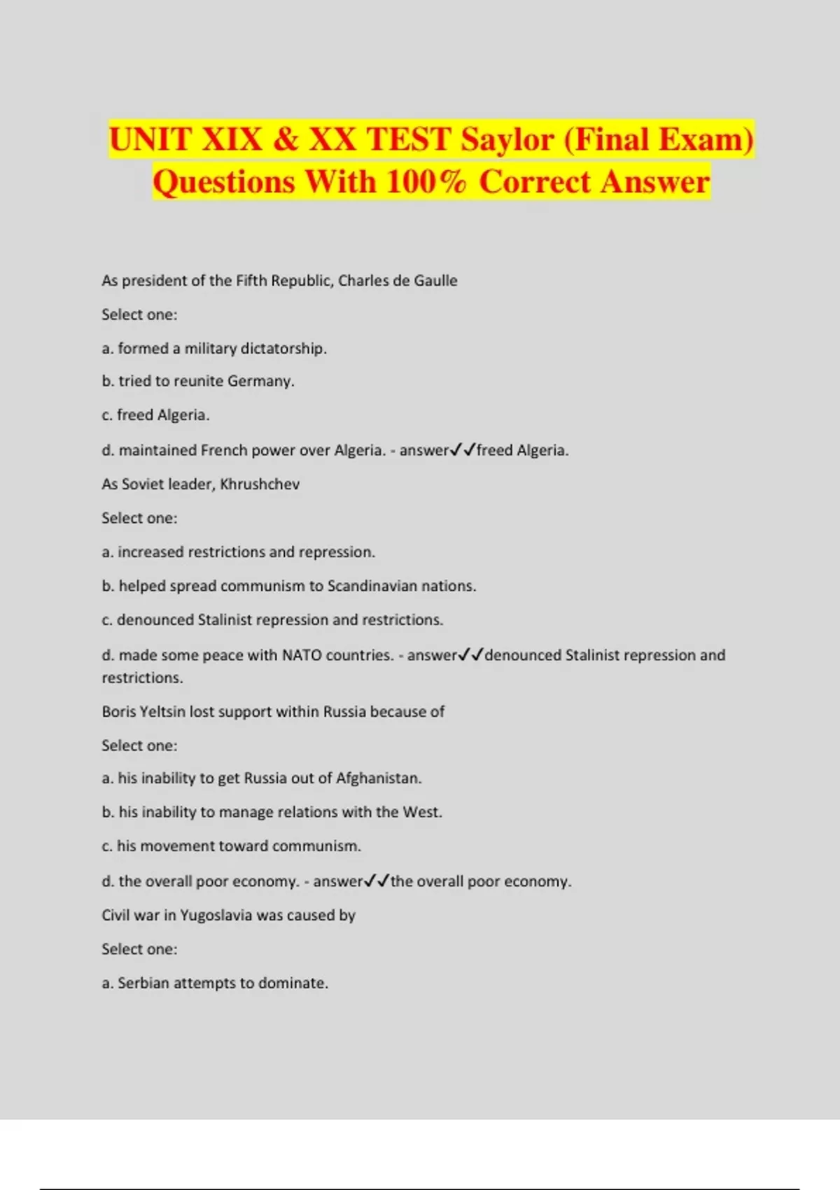UNIT XIX & XX TEST Saylor (Final Exam) Questions With 100% Correct Answer As president of the Fifth Republic, Charles de Gaulle Select one: a. formed a military dictatorship. b. tried to reunite Germany. c. freed Algeria. d. maintained French power over Algeria. - answerfreed Algeria. As Soviet leader, Khrushchev Select one: a. increased restrictions and repression. b. helped spread communism to Scandinavian nations. c. denounced Stalinist repression and restrictions. d. made some peace with NATO countries. - answerdenounced Stalinist repression and restrictions. Boris Yeltsin lost support within Russia because of Select one: a. his inability to get Russia out of Afghanistan. b. his inability to manage relations with the West. c. his movement toward communism. d. the overall poor economy. - answerthe overall poor economy. Civil war in Yugoslavia was caused by Select one: a. Serbian attempts to dominate. b. Croatian attempts to dominate. c. a communist revolution. d. mass executions of Slovenians. - answerSerbian attempts to dominate. Fear of invasion made the Soviets demand that Select one: a. Eastern European nations beco