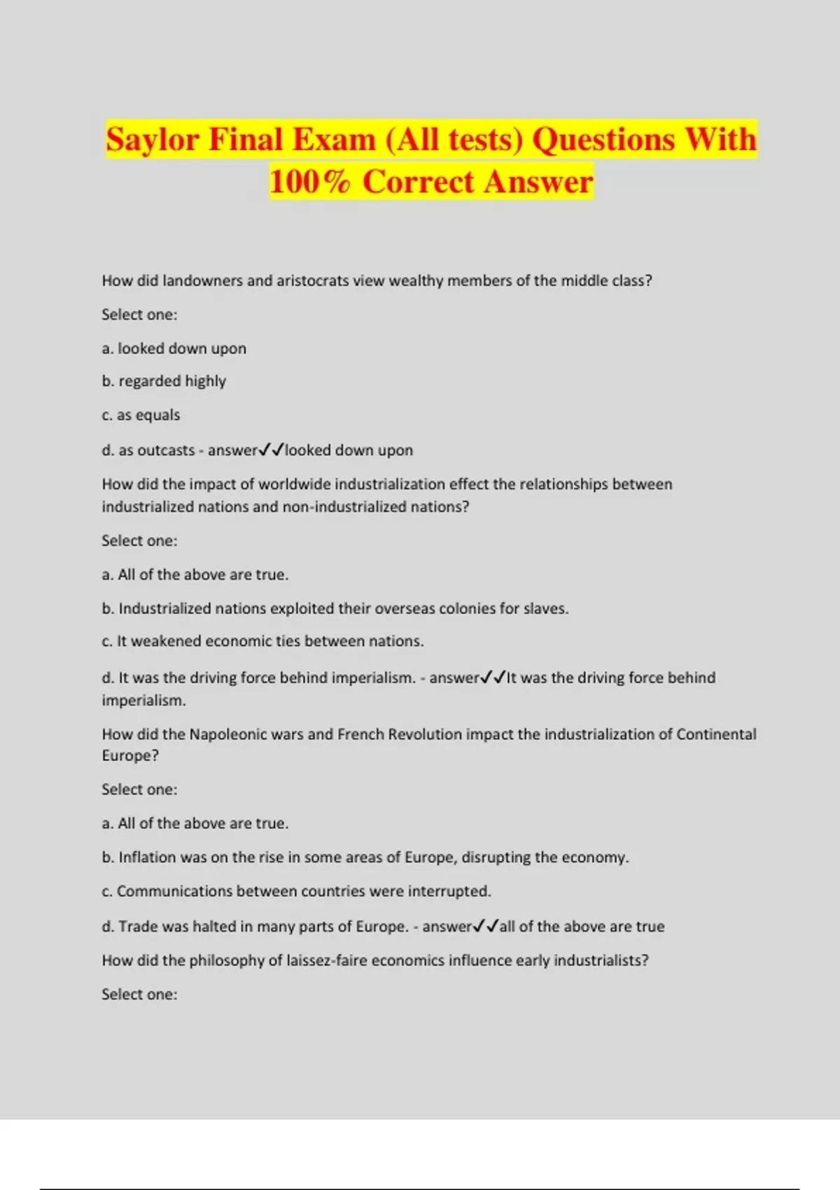 Saylor Final Exam (All tests) Questions With 100% Correct Answer How did landowners and aristocrats view wealthy members of the middle class? Select one: a. looked down upon b. regarded highly c. as equals d. as outcasts - answerlooked down upon How did the impact of worldwide industrialization effect the relationships between industrialized nations and non-industrialized nations? Select one: a. All of the above are true. b. Industrialized nations exploited their overseas colonies for slaves. c. It weakened economic ties between nations. d. It was the driving force behind imperialism. - answerIt was the driving force behind imperialism. How did the Napoleonic wars and French Revolution impact the industrialization of Continental Europe? Select one: a. All of the above are true. b. Inflation was on the rise in some areas of Europe, disrupting the economy. c. Communications between countries were interrupted. d. Trade was halted in many parts of Europe. - answerall of the above are true How did the philosophy of laissez-faire economics influence early industrialists? Select one: a. with ideas that the elite had a responsibility to give to charities b. all of the above c. with ideas of a free-market economy governed by natural laws, not government regulations d. with ideas of an economy supported by tariffs on foreign goods - answerwith ideas of a free-market economy governed by natural laws, not government regulations How might small farmers of the agricultural revolution be compared to the working class of the Industrial Revolution? Select one: a. Both suffered job losses due to progress. b. Both lived in climates of social restructuring. c. Both endured long working hours. d. All of the above are true. - answerall of the above are true What did Britain do in order to keep industrial secrets from the United States? Select one: a. charged impossible fees for the secrets to industrialization b. forbade engineers, mechanics, and toolmakers from leaving the country c. blockaded the United States from engaging in international trade d. sent messengers with misleading information to the United States - answerforbade engineers, mechanics, and toolmakers from leaving the country What impact did technological advances have on industry? Select one: a. Number of factory workers decreased. b. All of the above are true. c. Production of goods was increased. d. Quality of products was decreased. - answerProduction of goods was increased. What is the laissez-faire policy? Select one: a. a policy that let owners of industry set working conditions without government interference b. a policy that taught owners of industry how to set working conditions based on government standards c. a policy where labor created a committee to set working standards without interference from industry owners d. a policy that allowed labor to set working conditions based on votes on issues relevant to their industry - answera policy that let owners of industry set working conditions without government interference What is the name for the voluntary associations of workers seeking labor reforms? Select one: a. strikes b. utilitarianism c. unions d. collective bargaining - answerunions What was a benefit of the railroad in Britain? Select one: a. It offered cheap transportation for materials and goods. b. It eliminated hundreds of thousands of jobs. c. It encouraged people to emigrate to other countries. d. It displaced England's agricultural and fishing industries. - answerIt offered cheap transportation for materials and goods. What was the benefit of being a stockholder in a corporation? Select one: a. complete ownership of branch corporations b. free goods produced by the corporation c. not personally responsible for its debts d. all of the above - answernot personally responsible for its debts What was the Industrial Rev