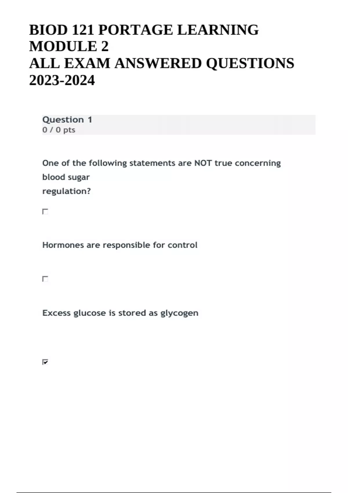 Question 1 0 / 0 pts One of the following statements are NOT true concerning blood sugar regulation? Hormones are responsible for control Excess glucose is stored as glycogen BIOD 121 PORTAGE LEARNING MODULE 2 ALL EXAM ANSWERED QUESTIONS Glucagon helps to lower blood sugar levels High blood sugar is called hyperglycemia When blood sugar levels are low, insulin is released from the pancreas Hypoglycemia refers to low blood sugar levels Normal blood sugar levels are 70-100 mg/dl Correct Answer Normal blood sugar levels are 55-130 mg/dl Hormones are responsible for control Liver intestine and rectum Question 4 0 / 0 pts Which organ makes bile to be used for fat digestion in the small intestine? Liver Pancreas Gallbladder Kidney Disaccharides Correct Answer Insoluble Fiber