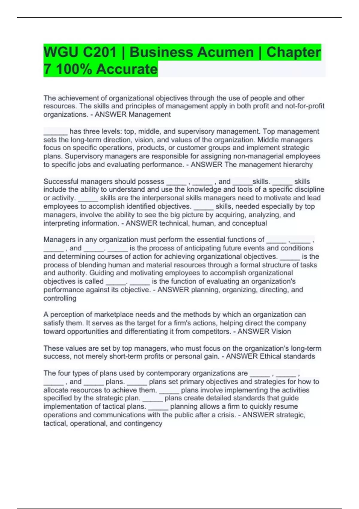The achievement of organizational objectives through the use of people and other resources. The skills and principles of management apply in both profit and not-for-profit organizations. - ANSWER Management ______ has three levels: top, middle, and supervisory management. Top management sets the long-term direction, vision, and values of the organization. Middle managers focus on specific operations, products, or customer groups and implement strategic plans. Supervisory managers are responsible for assigning non-managerial employees to specific jobs and evaluating performance. - ANSWER The management hierarchy Successful managers should possess _____ , _____ , and _____skills. _____ skills include the ability to understand and use the knowledge and tools of a specific discipline or activity. _____ skills are the interpersonal skills managers need to motivate and lead employees to accomplish identified objectives. _____ skills, needed especially by top managers, involve the ability to see the big picture by acquiring, analyzing, and interpreting information. - ANSWER technical, human, and conceptual Managers in any organization must perform the essential functions of _____ ,_____ , _____ , and _____. _____ is the process of anticipating future events and conditions and determining courses of action for achieving organizational objectives. _____ is the process of blending human and material resources through a formal structure of tasks and authority. Guiding and motivating employees to accomplish organizational objectives is called _____. _____ is the function of evaluating an organization's performance against its objective. - ANSWER planning, organizing, directing, and controlling A perception of marketplace needs and the methods by which an organization can satisfy them. It serves as the target for a firm's actions, helping direct the company toward opportunities and differentiating it from competitors. - ANSWER Vision These values are set by top managers, who must focus on the organization's long-term success, not merely short-term profits or personal gain. - ANSWER Ethical standards The four types of plans used by contemporary organizations are _____ , _____ , _____ , and _____ plans. _____ plans set primary objectives and strategies for how to allocate resources to achieve them. _____ plans involve implementing the activities specified by the strategic plan. _____ plans create detailed standards that guide implementation of tactical plans. _____ planning allows a firm to quickly resume operations and communications with the public after a crisis. - ANSWER strategic, tactical, operational, and contingency