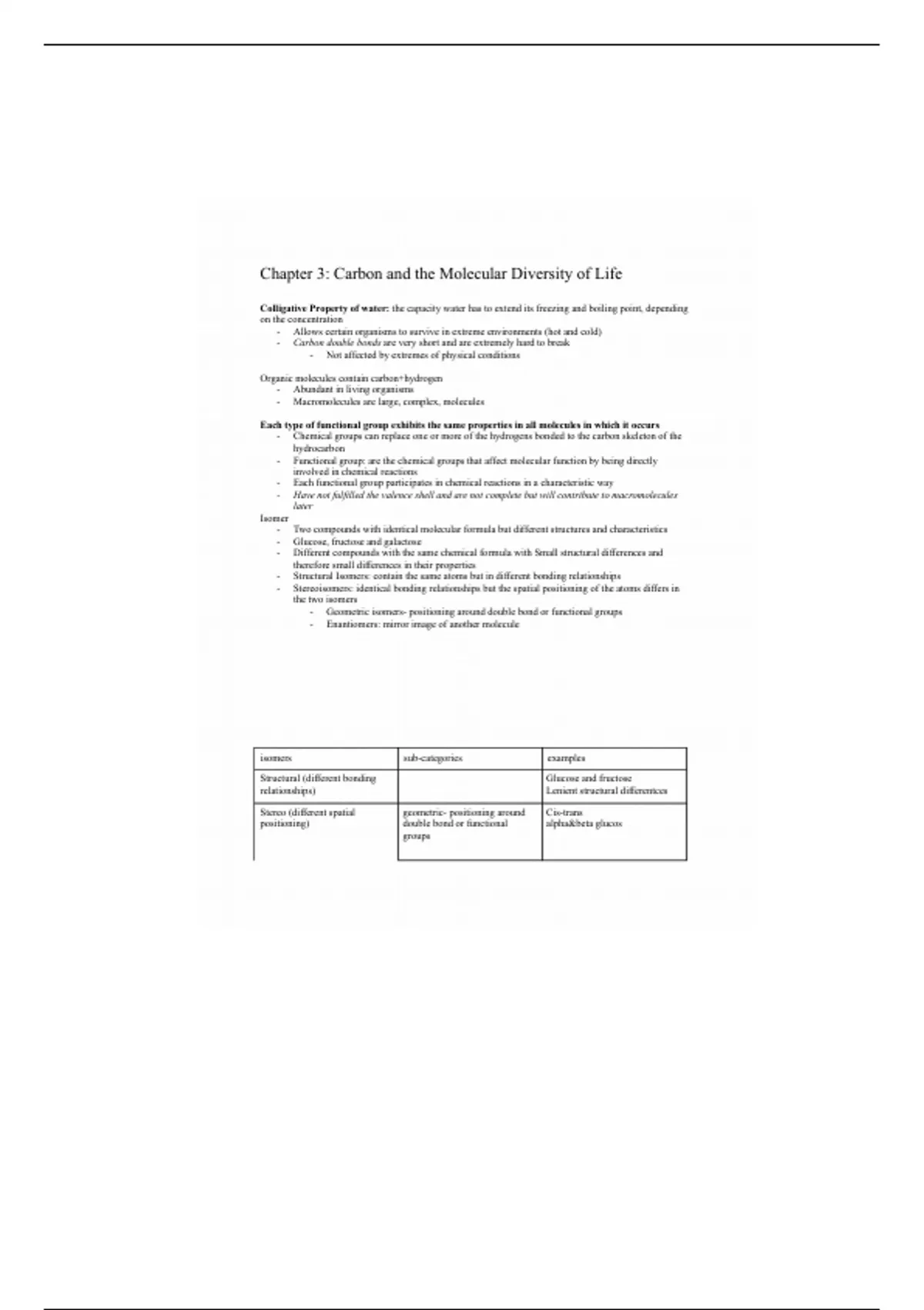 This is a comprehensive and detailed note for chapter 3 in Cell 1010, with emphasis on carbon and the molecular diversity of life. You'll need it!!