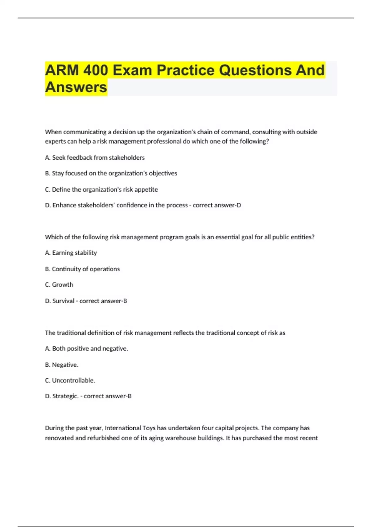 When communicating a decision up the organization's chain of command, consulting with outside experts can help a risk management professional do which one of the following? A. Seek feedback from stakeholders B. Stay focused on the organization's objectives C. Define the organization's risk appetite D. Enhance stakeholders' confidence in the process - correct answer-D Which of the following risk management program goals is an essential goal for all public entities? A. Earning stability B. Continuity of operations C. Growth D. Survival - correct answer-B The traditional definition of risk management reflects the traditional concept of risk as A. Both positive and negative. B. Negative. C. Uncontrollable. D. Strategic. - correct answer-B During the past year, International Toys has undertaken four capital projects. The company has renovated and refurbished one of its aging warehouse buildings. It has purchased the most recent
