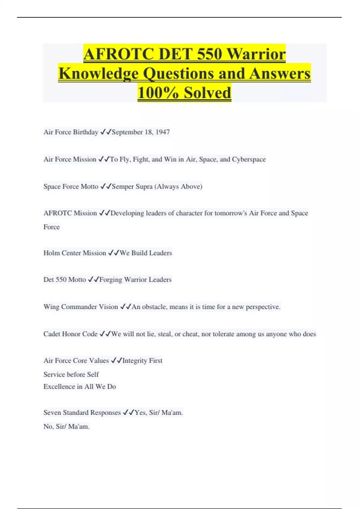 AFROTC DET 550 Warrior Knowledge Questions and Answers 100% Solved Air Force Birthday September 18, 1947 Air Force Mission To Fly, Fight, and Win in Air, Space, and Cyberspace Space Force Motto Semper Supra (Always Above) AFROTC Mission Developing leaders of character for tomorrow's Air Force and Space Force Holm Center Mission We Build Leaders Det 550 Motto Forging Warrior Leaders Wing Commander Vision An obstacle, means it is time for a new perspective. Cadet Honor Code We will not lie, steal, or cheat, nor tolerate among us anyone who does Air Force Core Values Integrity First Service before Self Excellence in All We Do Seven Standard Responses Yes, Sir/ Ma'am. No, Sir/ Ma'am.