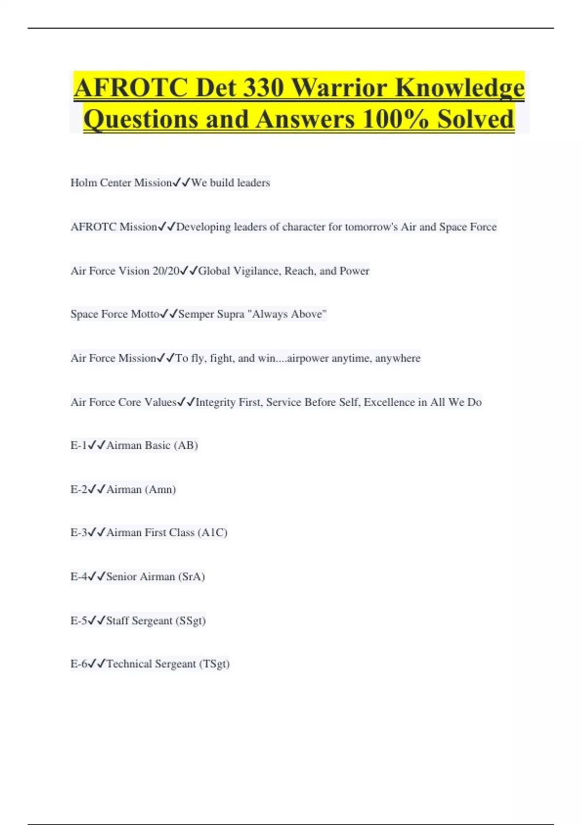 AFROTC Det 330 Warrior Knowledge Questions and Answers 100% Solved Holm Center MissionWe build leaders AFROTC MissionDeveloping leaders of character for tomorrow's Air and Space Force Air Force Vision 20/20Global Vigilance, Reach, and Power Space Force MottoSemper Supra "Always Above" Air Force MissionTo fly, fight, and win....airpower anytime, anywhere Air Force Core ValuesIntegrity First, Service Before Self, Excellence in All We Do E-1Airman Basic (AB) E-2Airman (Amn) E-3Airman First Class (A1C) E-4Senior Airman (SrA) E-5Staff Sergeant (SSgt)
