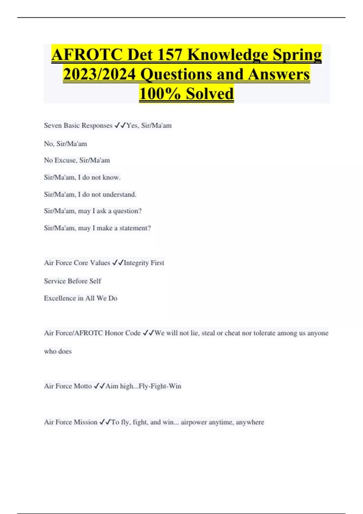 AFROTC Det 157 Knowledge Spring 2023/2024 Questions and Answers 100% Solved Seven Basic Responses Yes, Sir/Ma'am No, Sir/Ma'am No Excuse, Sir/Ma'am Sir/Ma'am, I do not know. Sir/Ma'am, I do not understand. Sir/Ma'am, may I ask a question? Sir/Ma'am, may I make a statement? Air Force Core Values Integrity First Service Before Self Excellence in All We Do Air Force/AFROTC Honor Code We will not lie, steal or cheat nor tolerate among us anyone who does Air Force Motto Aim high...Fly-Fight-Win Air Force Mission To fly, fight, and win... airpower anytime, anywhere