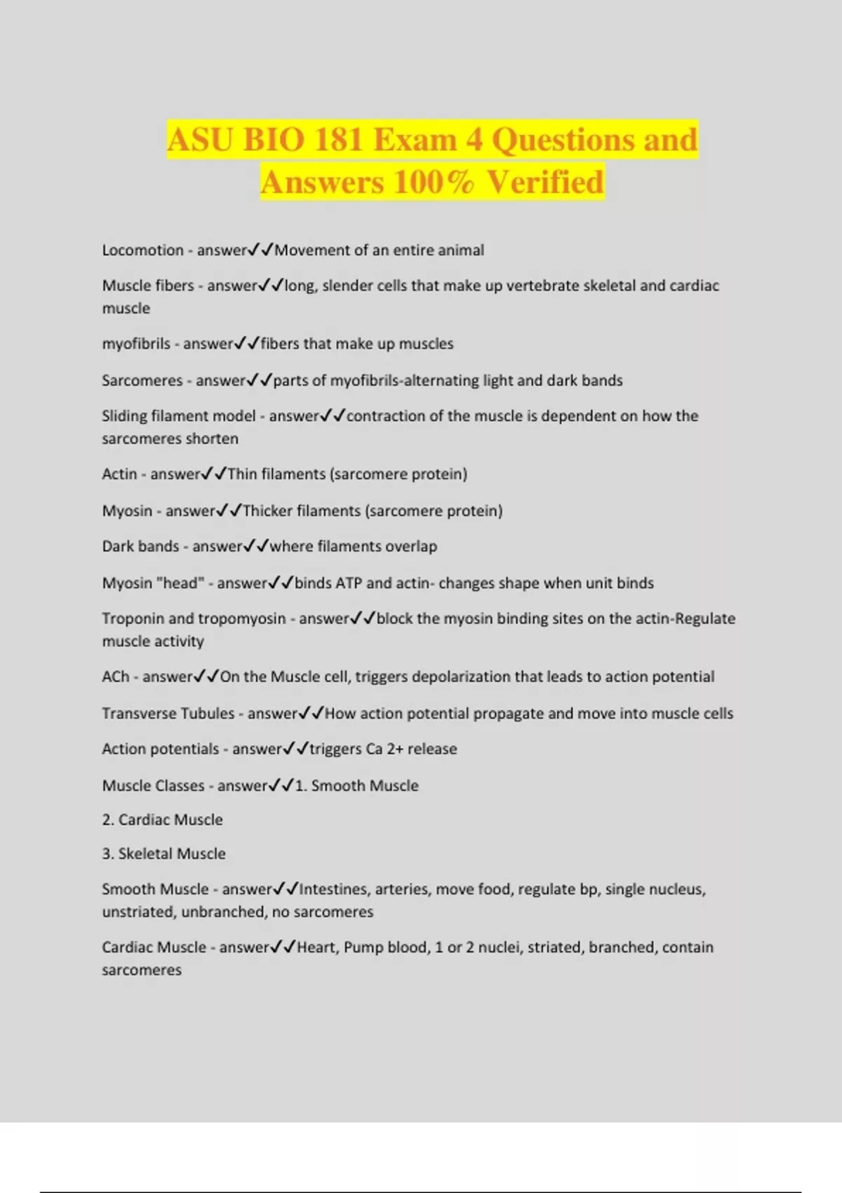 ASU BIO 181 Exam 4 Questions and Answers 100% Verified Locomotion - answerMovement of an entire animal Muscle fibers - answerlong, slender cells that make up vertebrate skeletal and cardiac muscle myofibrils - answerfibers that make up muscles Sarcomeres - answerparts of myofibrils-alternating light and dark bands Sliding filament model - answercontraction of the muscle is dependent on how the sarcomeres shorten Actin - answerThin filaments (sarcomere protein) Myosin - answerThicker filaments (sarcomere protein) Dark bands - answerwhere filaments overlap Myosin "head" - answerbinds ATP and actin- changes shape when unit binds Troponin and tropomyosin - answerblock the myosin binding sites on the actin-Regulate muscle activity ACh - answerOn the Muscle cell, triggers depolarization that leads to action potential Transverse Tubules - answerHow action potential propagate and move into muscle cells Action potentials - answertriggers Ca 2+ release Muscle Classes - answer1. Smooth Muscle 2. Cardiac Muscle 3. Skeletal Muscle Smooth Muscle - answerIntestines, arteries, move food, regulate bp, single nucleus, unstriated, unbranched, no sarcomeres Cardiac Muscle - answerHeart, Pump blood, 1 or 2 nuclei, striated, branched, contain sarcomeres Skeletal Muscle - answerAttached to skeleton, move skeleton, multinucleate, striated, unbranched, contain sarcomeres Parasympathetic (Smooth) - answerACh stimulates contraction fo smooth muscle in stomach and intestine Sympathetic (Smooth) - answerNorepinephrine inhibits contraction of smooth muscle in stomach and intestine (Epinephrine also rele