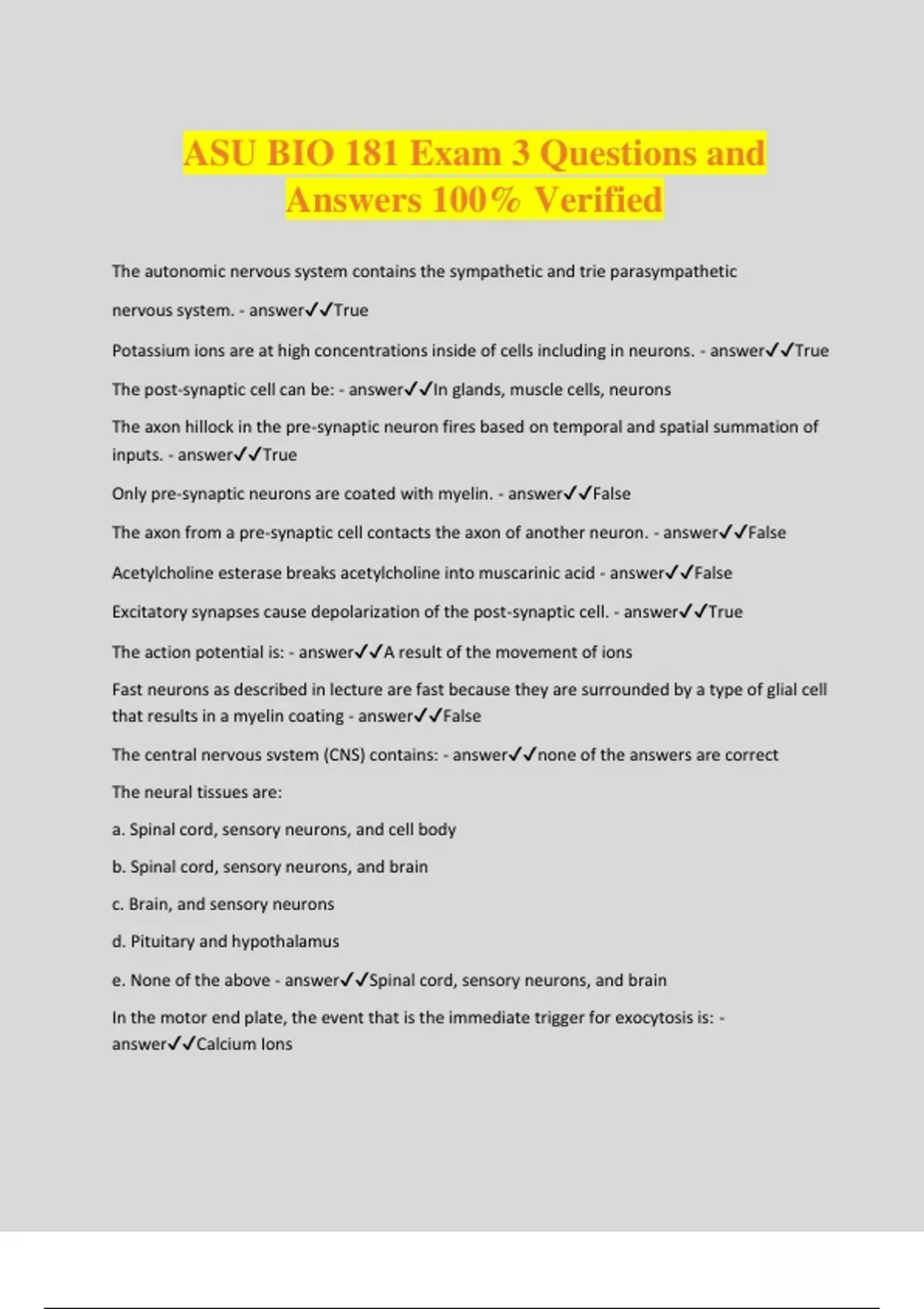 ASU BIO 181 Exam 3 Questions and Answers 100% Verified The autonomic nervous system contains the sympathetic and trie parasympathetic nervous system. - answerTrue Potassium ions are at high concentrations inside of cells including in neurons. - answerTrue The post-synaptic cell can be: - answerIn glands, muscle cells, neurons The axon hillock in the pre-synaptic neuron fires based on temporal and spatial summation of inputs. - answerTrue Only pre-synaptic neurons are coated with myelin. - answerFalse The axon from a pre-synaptic cell contacts the axon of another neuron. - answerFalse Acetylcholine esterase breaks acetylcholine into muscarinic acid - answerFalse Excitatory synapses cause depolarization of the post-synaptic cell. - answerTrue The action potential is: - answerA result of the movement of ions Fast neurons as described in lecture are fast because they are surrounded by a type of glial cell that results in a myelin coating - answerFalse The central nervous svstem (CNS) contains: - answernone of the answers are correct The neural tissues are: a. Spinal cord, sensory neurons, and cell body b. Spinal cord, sensory neurons, and brain c. Brain, and sensory neurons d. Pituitary and hypothalamus e. None of the above - answerSpinal cord, sensory neurons, and brain In the motor end plate, the event that is the immediate trigger for exocytosis is: - answerCalcium Ions The membrane potential (resting potential) is largely set by the Na-K-ATPase pump. - answertrue The cell body refers to the part of the neurons that begin at the dendrites and extend to the axon terminal. - answerfalse Acetylcholine exocytosed from the presynaptic cell travels to the postsynaptic cell to start the action potential in the postsynaptic cell. - answertrue Fast neurons as described in lecture require cytoplasmic signal transduction to open an ion channel. - answerFalse Excitatory synapses cause hyperpolarization of post-synaptic cells. - answerfalse