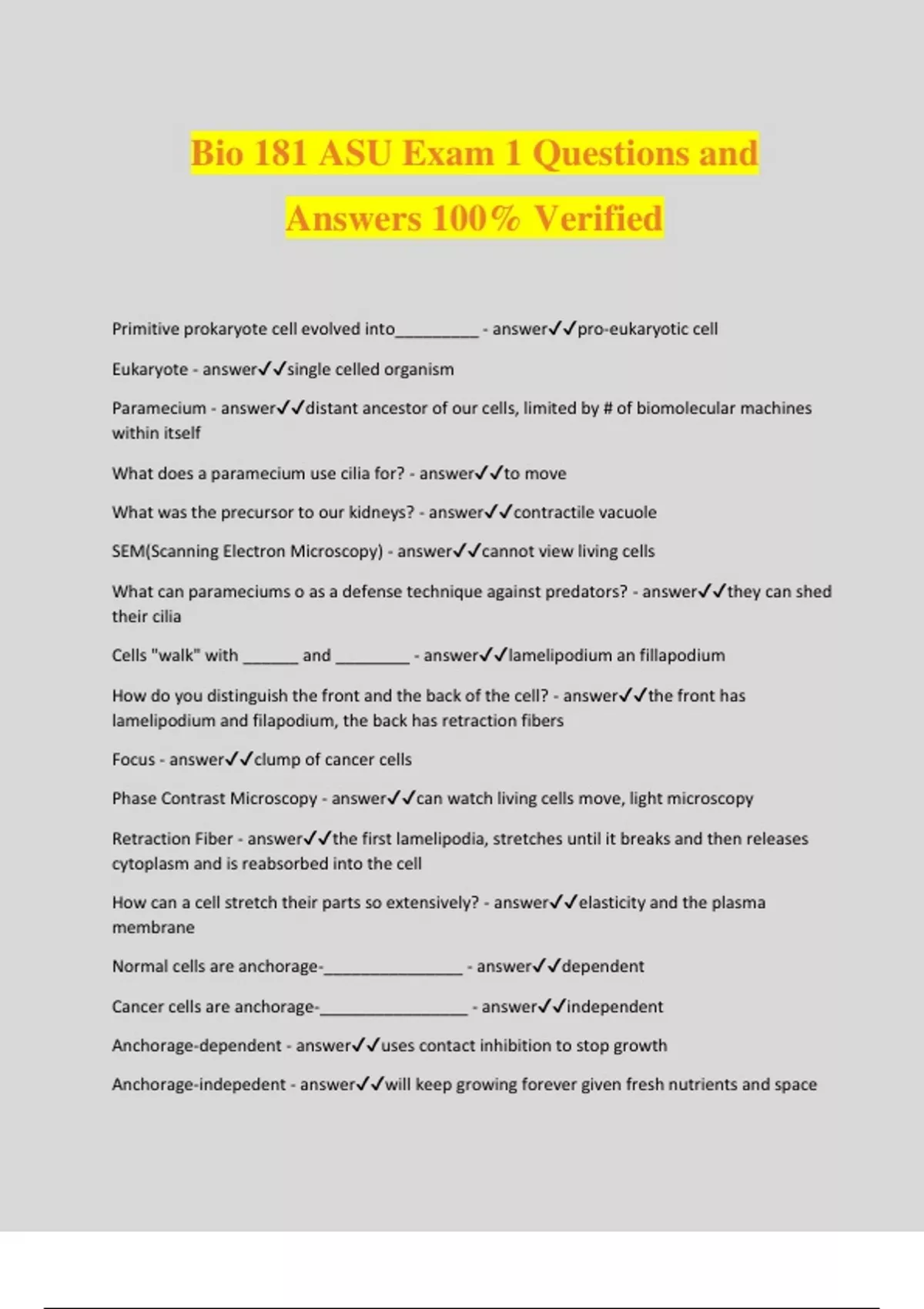 Bio 181 ASU Exam 1 Questions and Answers 100% Verified Primitive prokaryote cell evolved into_________ - answerpro-eukaryotic cell Eukaryote - answersingle celled organism Paramecium - answerdistant ancestor of our cells, limited by # of biomolecular machines within itself What does a paramecium use cilia for? - answerto move What was the precursor to our kidneys? - answercontractile vacuole SEM(Scanning Electron Microscopy) - answercannot view living cells What can parameciums o as a defense technique against predators? - answerthey can shed their cilia Cells "walk" with ______ and ________ - answerlamelipodium an fillapodium How do you distinguish the front and the back of the cell? - answerthe front has lamelipodium and filapodium, the back has retraction fibers Focus - answerclump of cancer cells Phase Contrast Microscopy - answercan watch living cells move, light microscopy Retraction Fiber - answerthe first lamelipodia, stretches until it breaks and then releases cytoplasm and is reabsorbed into the cell How can a cell stretch their parts so extensively? - answerelasticity and the plasma membrane Normal cells are anchorage-_______________ - answerdependent Cancer cells are anchorage-________________ - answerindependent Anchorage-dependent - answeruses contact inhibition to stop growth Anchorage-indepedent - answerwill keep growing forever given fresh nutrients and space