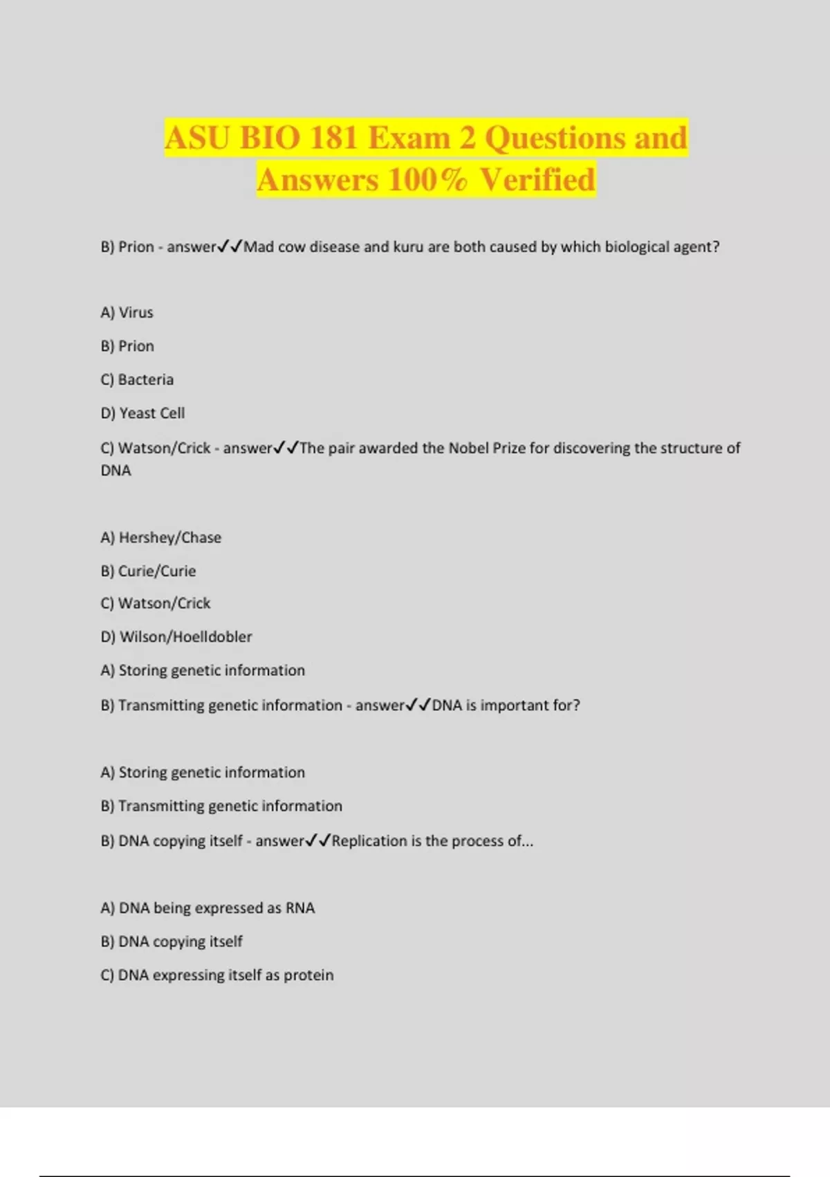 ASU BIO 181 Exam 2 Questions and Answers 100% Verified B) Prion - answerMad cow disease and kuru are both caused by which biological agent? A) Virus B) Prion C) Bacteria D) Yeast Cell C) Watson/Crick - answerThe pair awarded the Nobel Prize for discovering the structure of DNA A) Hershey/Chase B) Curie/Curie C) Watson/Crick D) Wilson/Hoelldobler A) Storing genetic information B) Transmitting genetic information - answerDNA is important for? A) Storing genetic information B) Transmitting genetic information B) DNA copying itself - answerReplication is the process of... A) DNA being expressed as RNA B) DNA copying itself C) DNA expressing itself as protein D) DNA forming ribosomes B) 40% - answerIf the guanine content of DNA from the bacterial cells is 40%, what is the cytosine content? A) 20% B) 40% C) 10% D) 5% C) 20% - answerIf the cytosine content of DNA from the bacterial cells is 30%, what is the adenine content? A) 10% B) 40% C) 20% D) 5% A) histones and DNA - answerChromatin is composed of: A) histones and DNA B) histones, DNA, and basic proteins C) histones, DNA, and RNA D) histones and DNA surrounded by a membrane B) Uracil - answerWhich one of the following nucleotides hydrogen base pairs with adenine in an RNA molecule? A) Cytosine B) Uracil C) Thymine D) Guanine A) 16% thymidine, 34% guanine, 34% cytosine - answer16% of the nucleotides are adenine. What are the percentages of the other nucleotides? A) 16% thymidine, 34% guanine, 34% cytosine B) 34% thymidine, 34% guanine, 16% cytosine C) 34% uracil, 16% guanine, 16% cytosine D) 34% thymidine, 16% guanine, 34% cytosine A) antiparallel B) complementary - answerThe strands in a DNA molecule are: A) antiparallel B) complementary C) perpendicular D) covalently bonded to each other C) RNA - answerThe original molecule of life may have been... A) DNA B) Prions C) RNA D) Viruses A) DNA to RNA to protein - answerThe central dogma of molecular biology states... A) DNA to RNA to protein B) RNA to DNA to protein C) RNA to RNA to protein D) RNA or DNA to protein A) uracil - answerIn RNA, which nucleotide base r