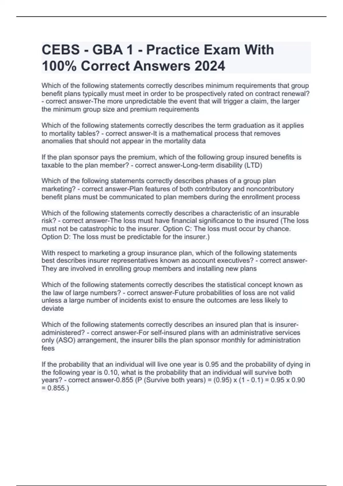 CEBS - GBA 1 - Practice Exam With 100% Correct Answers 2024
