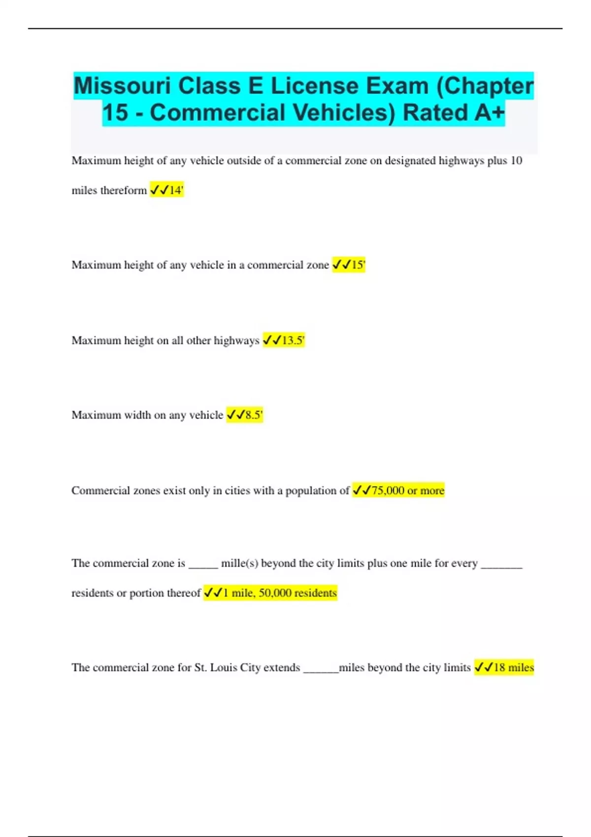 Missouri Class E License Exam (Chapter 15 - Commercial Vehicles) Rated A+ Maximum height of any vehicle outside of a commercial zone on designated highways plus 10 miles thereform 14' Maximum height of any vehicle in a commercial zone 15' Maximum height on all other highways 13.5' Maximum width on any vehicle 8.5' Commercial zones exist only in cities with a population of 75,000 or more The commercial zone is _____ mille(s) beyond the city limits plus one mile for every _______ residents or portion thereof 1 mile, 50,000 residents The commercial zone for St. Louis City extends ______miles beyond the city limits 18 miles The commercial zone for Kansas City extends _______ miles beyond the city limits and includes the city of Harrisonville 12 miles The commercial zones for Springfield, St. Joseph, and Columbia extends only _______ miles beyond the city limits 2 miles The commercial zone on interstate highways extends only ______ miles beyond the city limits 2 miles Maximum length of any single vehicle 45' Maximum length of any bus or trackless trolley coach not including one foot in the front and back for safety bumper 45' Maximum length of truck-tractor and semi-trailer upon interstates and certain designated highways the length of the semi-trailer (no overall maximum length, includes load) 53' Maximum length of truck-tractor and semi-trailer upon all other roads 60' Maximum length of truck-tractor, semi-trailer, and trailer combinations (double bottoms) upon interstates and certain designated highways the length of the semi-trailer or trailer (no overall maximum weight) 28' Maximum length of truck-trailer, semi-trailer, and trailer combinations (double bottoms) upon all other roads 65' Maximum length of truck and trailer(s) and all other combination vehicles upon interstates and certain primary highways 65' Maximum length of truck and trailer(s) and all other combination vehicles the overall maximum length upon all other roads 55' Maximum length of automobile transporters and boat transporters - conventional 5th wheel and stingersteered 75' (for combination unit plus 3'' front to 4' rear overhang) Maximum length of Driveaway Saddle Mount Combinations (double or triple on interstate and designated highways) 97' Motor vehicle carriers may carry loads that extend beyond their legal length limits by 3' beyond the front and 4' beyond the rear Exemptions from size limits 1. farm machinery driven occasionally for short distances 2. vehicles temporarily transporting farm machinery 3. implement dealers delivering or moving farm machinery for repair 4. vehicles temporarily transporting road-making machines or road materials 5. vehicles towing disabled vehicles for repair on highways Maximum weight on any single axle allowed on interstates 20,000 pounds Maximum weight on any single axle allowed in a commercial zone 22,400 pounds Maximum weight on any single axle allowed on all other routes 22,000 pounds Maximum weight on any tandem axle allowed on interstates 34,000 pounds Maximum weight on any tandem axle allowed on all other routes 36,000 pounds Actual gross weight allowed depends on the distance from _______ to _______. the first axel to the last axle