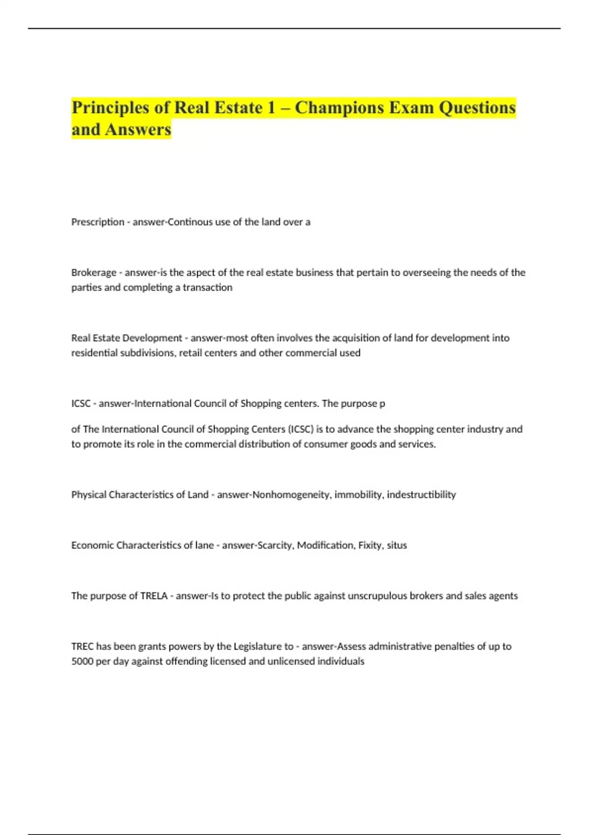Prescription - answer-Continous use of the land over a Brokerage - answer-is the aspect of the real estate business that pertain to overseeing the needs of the parties and completing a transaction Real Estate Development - answer-most often involves the acquisition of land for development into residential subdivisions, retail centers and other commercial used ICSC - answer-International Council of Shopping centers. The purpose p of The International Council of Shopping Centers (ICSC) is to advance the shopping center industry and to promote its role in the commercial distribution of consumer goods and services. Physical Characteristics of Land - answer-Nonhomogeneity, immobility, indestructibility Economic Characteristics of lane - answer-Scarcity, Modification, Fixity, situs The purpose of TRELA - answer-Is to protect the public against unscrupulous brokers and sales agents TREC has been grants powers by the Legislature to - answer-Assess administrative penalties of up to 5000 per day against offending licensed and unlicensed individuals