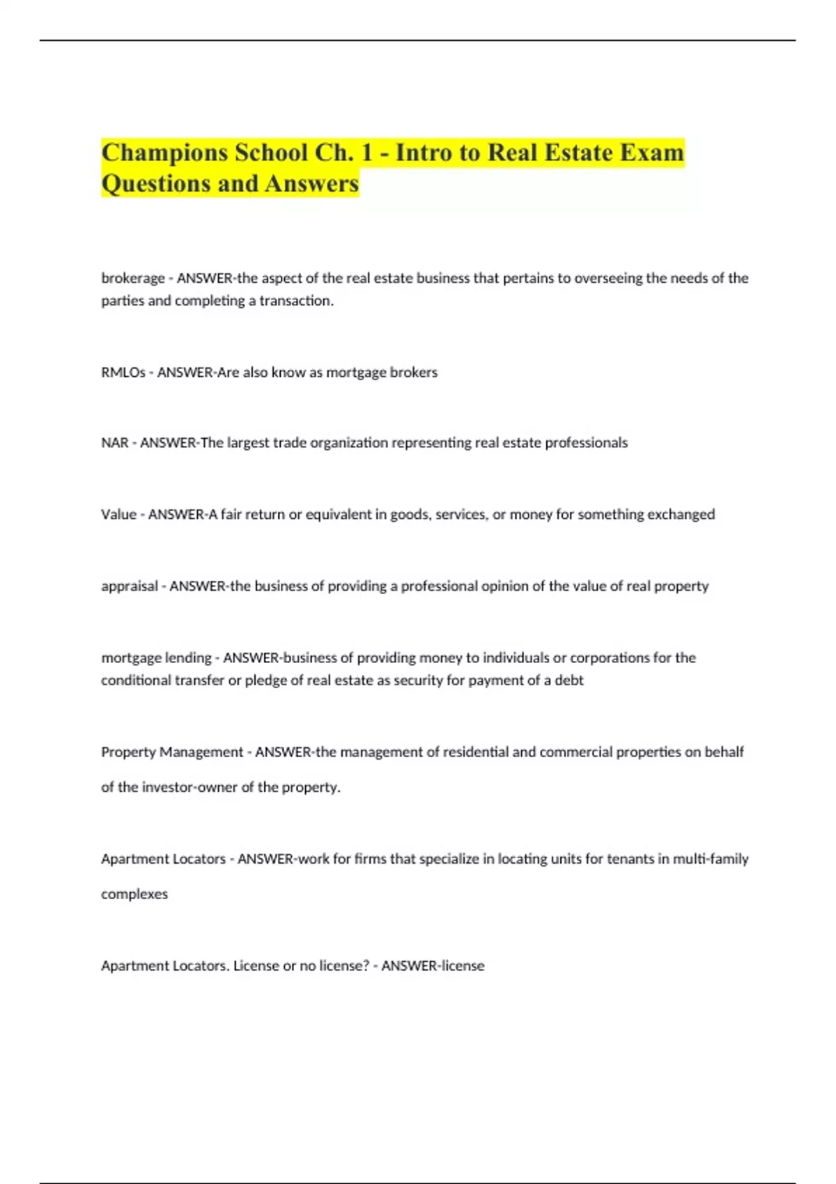 Champions School Ch. 1 - Intro to Real Estate Exam Questions and Answers