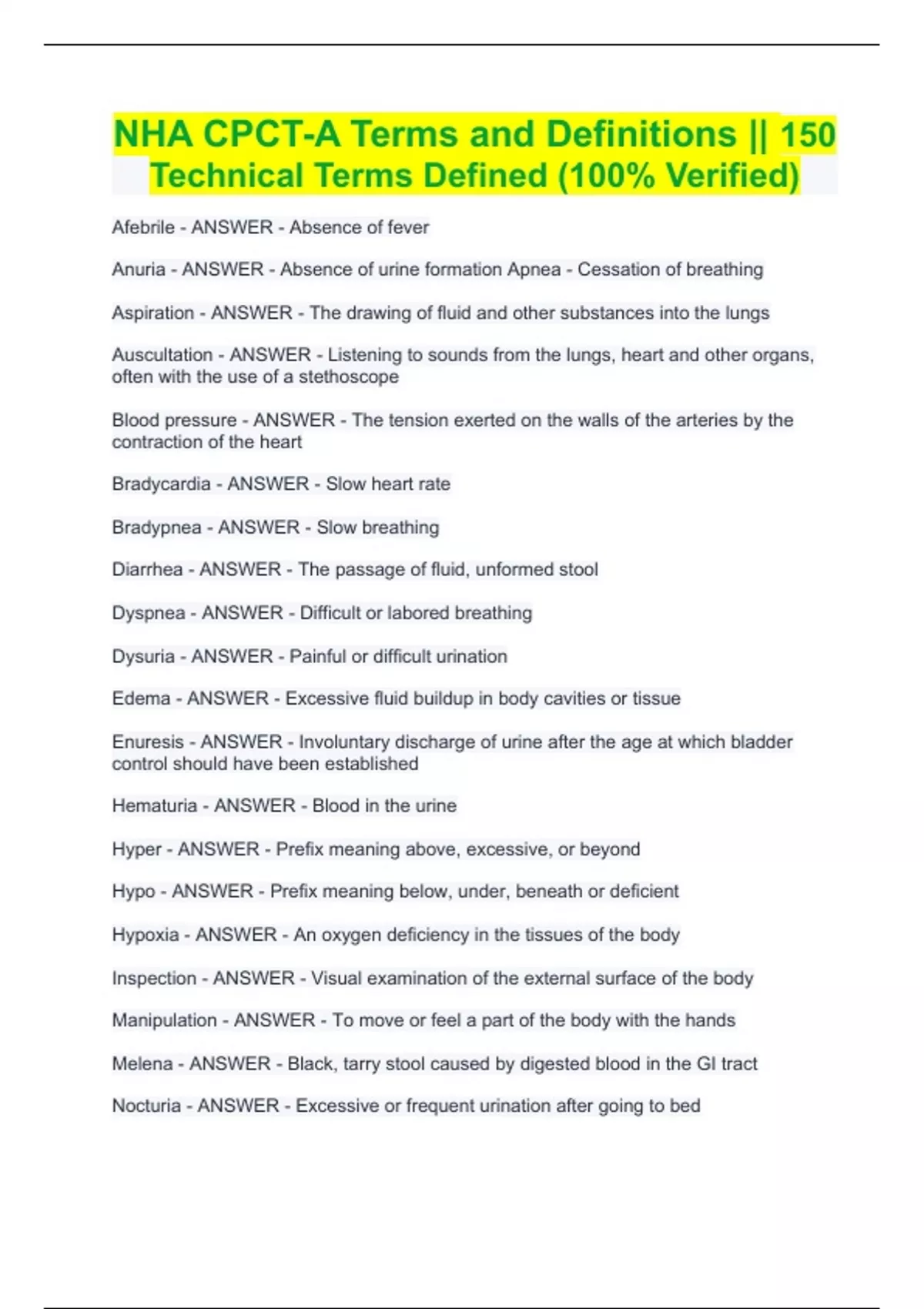 NHA CPCT-A Terms and Definitions || 150 Technical Terms Defined (100% Verified) NHA CPCT-A Terms and Definitions || 150 Technical Terms Defined (100% Verified) Afebrile - ANSWER - Absence of fever Anuria - ANSWER - Absence of urine formation Apnea - Cessation of breathing Aspiration - ANSWER - The drawing of fluid and other substances into the lungs Auscultation - ANSWER - Listening to sounds from the lungs, heart and other organs, often with the use of a stethoscope Blood pressure - ANSWER - The tension exerted on the walls of the arteries by the contraction of the heart Bradycardia - ANSWER - Slow heart rate Bradypnea - ANSWER - Slow breathing Diarrhea - ANSWER - The passage of fluid, unformed stool Dyspnea - ANSWER - Difficult or labored breathing Dysuria - ANSWER - Painful or difficult urination Edema - ANSWER - Excessive fluid buildup in body cavities or tissue Enuresis - ANSWER - Involuntary discharge of urine after the age at which bladder control should have been established Hematuria - ANSWER - Blood in the urine Hyper - ANSWER - Prefix meaning above, excessive, or beyond Hypo - ANSWER - Prefix meaning below, under, beneath or deficient Hypoxia - ANSWER - An oxygen deficiency in the tissues of the body Inspection - ANSWER - Visual examination of the external surface of the body Manipulation - ANSWER - To move or feel a part of the body with the hands Melena - ANSWER - Black, tarry stool caused by digested blood in the GI tract Nocturia - ANSWER - Excessive or frequent urination after going to bed Orthopnea - ANSWER - Labored breathing that occurs while lying flat and improves when standing or sitting up Ostomy - ANSWER - A surgically formed fistula connecting a portion of intestine or urinary tract to a site outside the body Palpate - ANSWER - Examine by touch Percussion - ANSWER - Tapping a body part (usually with a finger or a small hammer) to determine position, size, or density of underlying organ Polyuria - ANSWER - Excessive production of urine