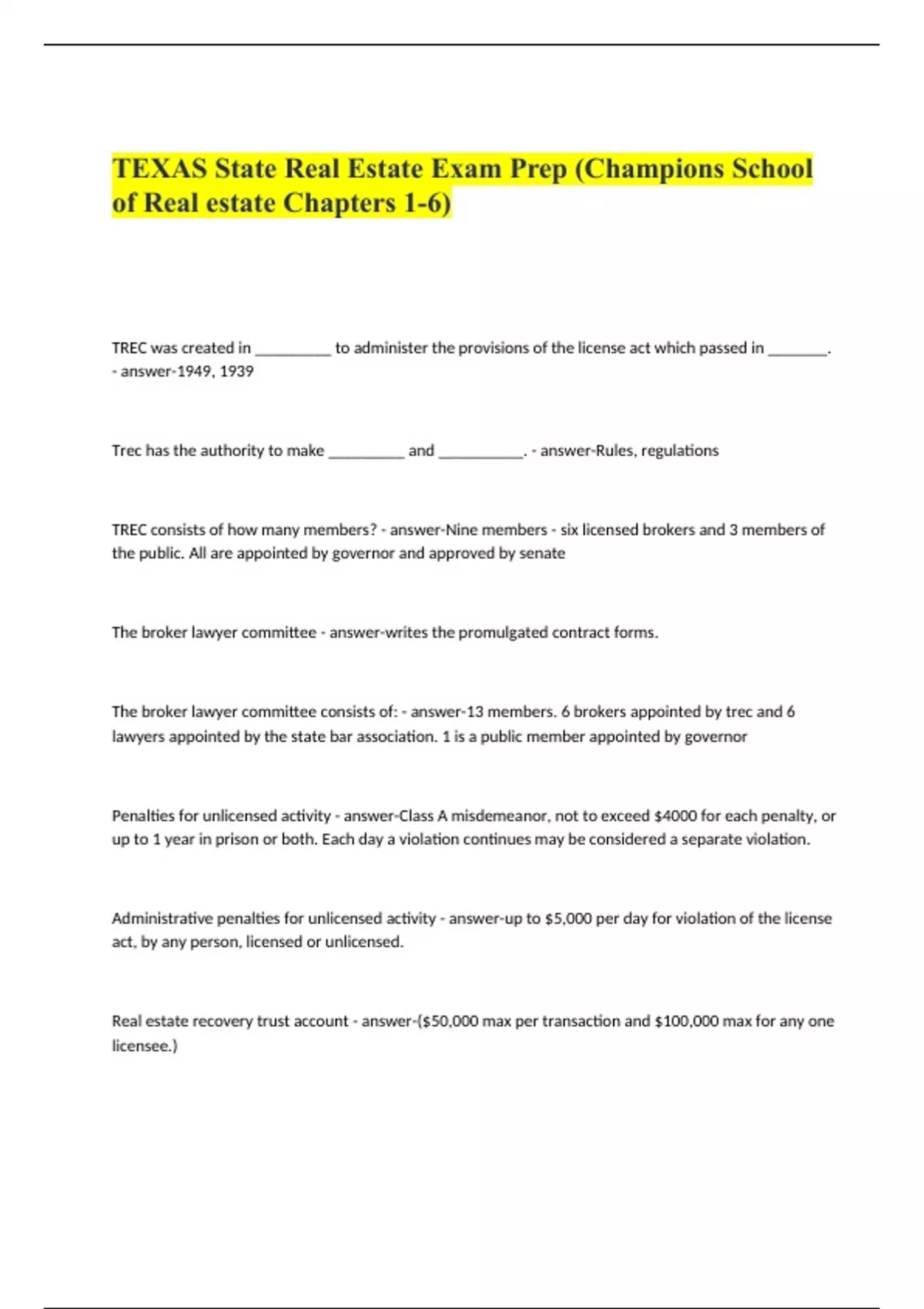 TREC was created in _________ to administer the provisions of the license act which passed in _______. - answer-1949, 1939 Trec has the authority to make _________ and __________. - answer-Rules, regulations TREC consists of how many members? - answer-Nine members - six licensed brokers and 3 members of the public. All are appointed by governor and approved by senate The broker lawyer committee - answer-writes the promulgated contract forms. The broker lawyer committee consists of: - answer-13 members. 6 brokers appointed by trec and 6 lawyers appointed by the state bar association. 1 is a public member appointed by governor Penalties for unlicensed activity - answer-Class A misdemeanor, not to exceed $4000 for each penalty, or up to 1 year in prison or both. Each day a violation continues may be considered a separate violation. Administrative penalties for unlicensed activity - answer-up to $5,000 per day for violation of the license act, by any person, licensed or unlicensed. Real estate recovery trust account - answer-($50,000 max per transaction and $100,000 max for any one licensee.) If fund falls below $1 mill, trec can charge all licensee's a $10 fee until balance goes back up to $1.7 million. If balance is above $3.5 million, Trec reduces value by flushing excess to the general fund of of texas.
