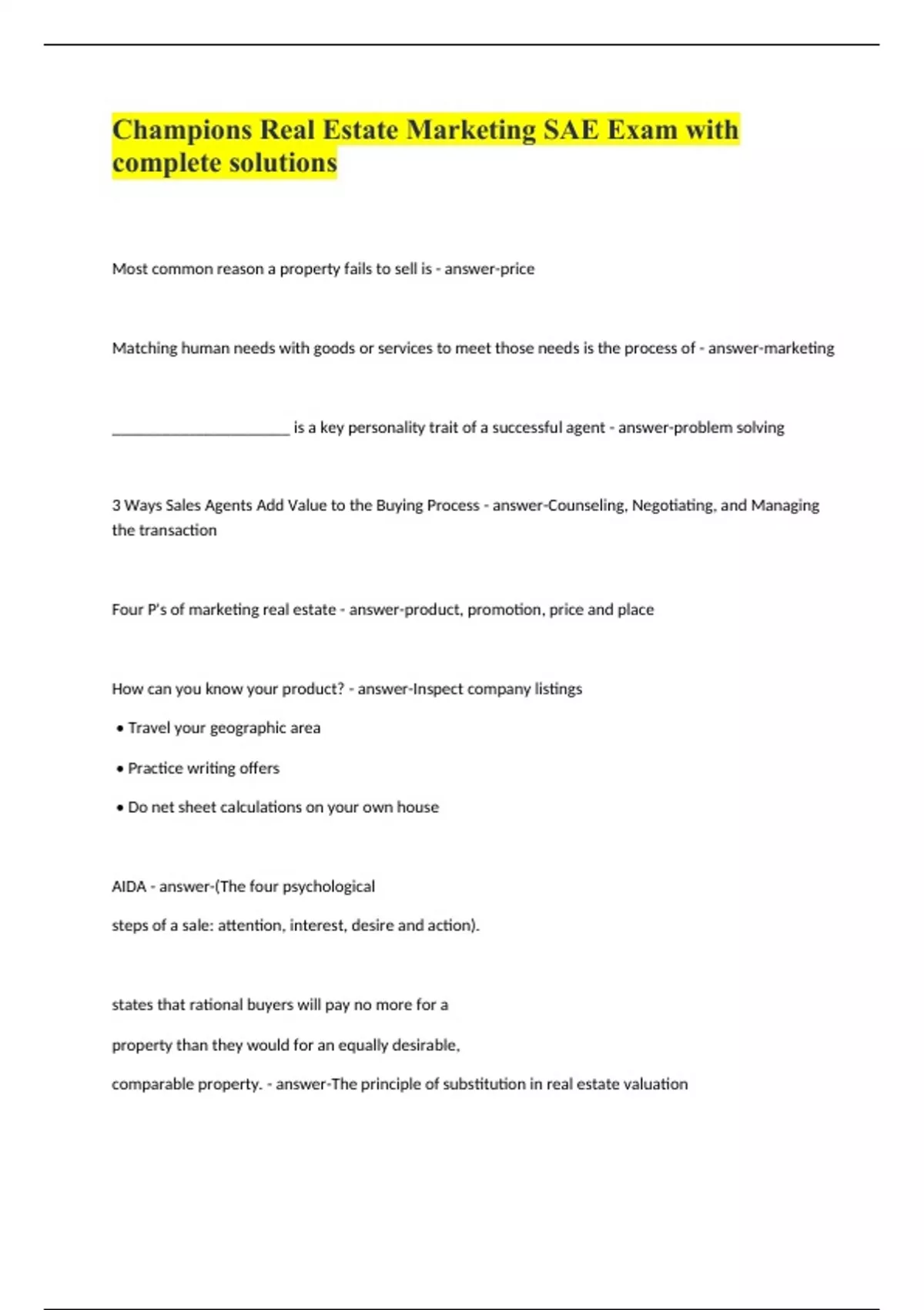 Most common reason a property fails to sell is - answer-price Matching human needs with goods or services to meet those needs is the process of - answer-marketing _____________________ is a key personality trait of a successful agent - answer-problem solving 3 Ways Sales Agents Add Value to the Buying Process - answer-Counseling, Negotiating, and Managing the transaction Four P's of marketing real estate - answer-product, promotion, price and place How can you know your product? - answer-Inspect company listings • Travel your geographic area • Practice writing offers • Do net sheet calculations on your own house AIDA - answer-(The four psychological steps of a sale: attention, interest, desire and action). states that rational buyers will pay no more for a property than they would for an equally desirable, comparable property. - answer-The principle of substitution in real estate valuation
