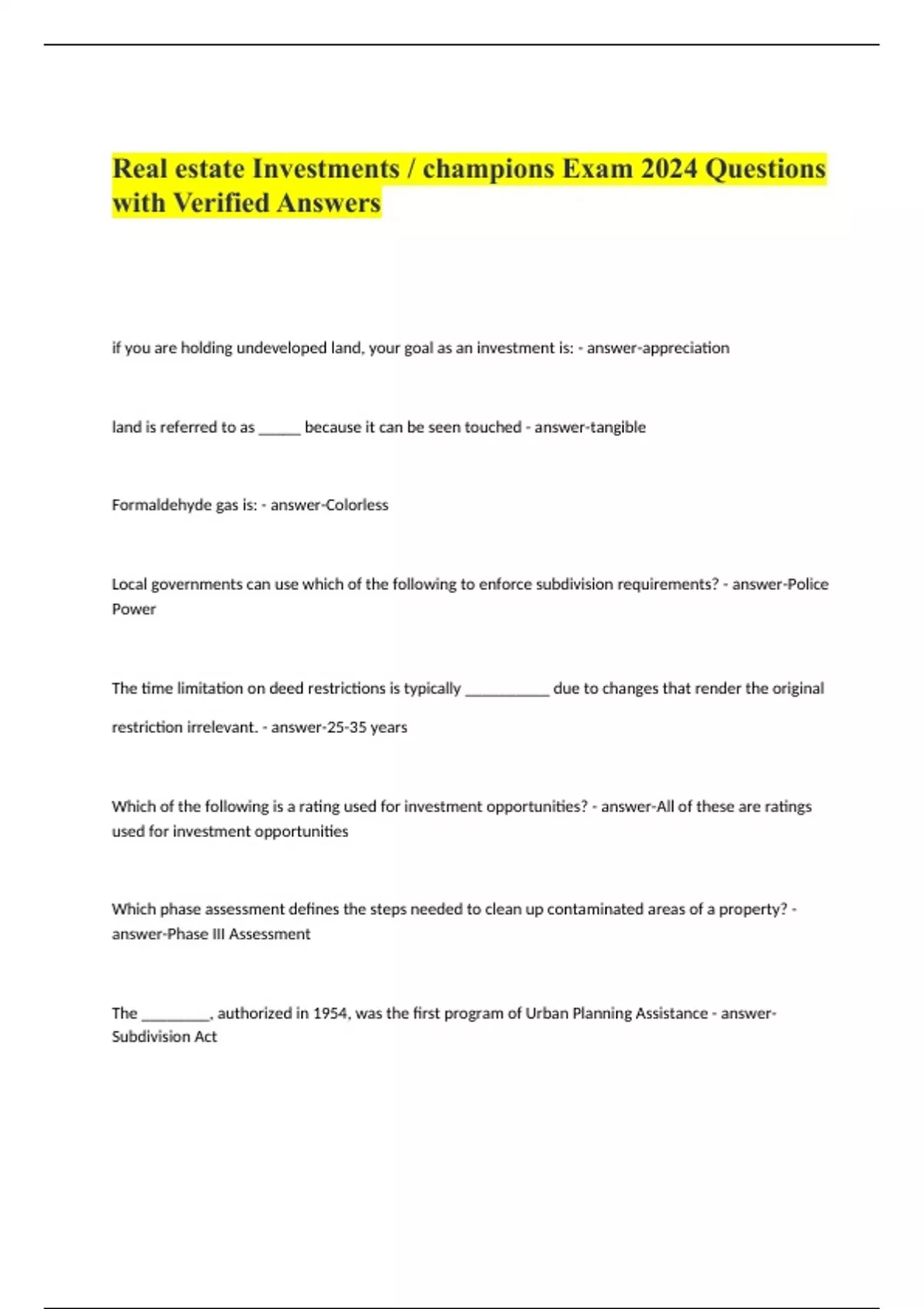 Real estate Investments / champions Exam 2024 Questions with Verified Answers