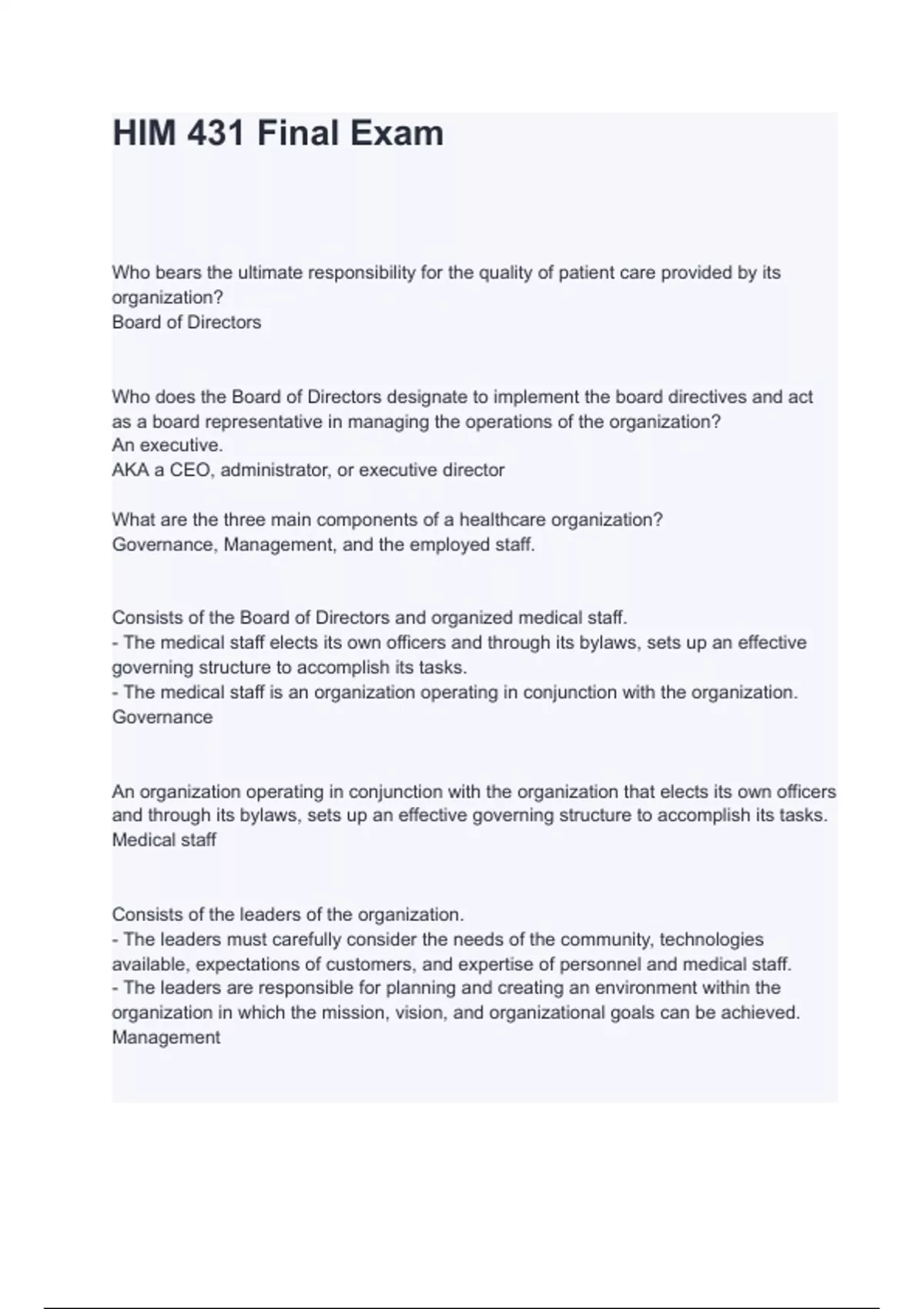 Who bears the ultimate responsibility for the quality of patient care provided by its organization? Board of Directors Who does the Board of Directors designate to implement the board directives and act as a board representative in managing the operations of the organization? An executive. AKA a CEO, administrator, or executive director What are the three main components of a healthcare organization? Governance, Management, and the employed staff. Consists of the Board of Directors and organized medical staff. - The medical staff elects its own officers and through its bylaws, sets up an effective governing structure to accomplish its tasks. - The medical staff is an organization operating in conjunction with the organization. Governance An organization operating in conjunction with the organization that elects its own officers and through its byla