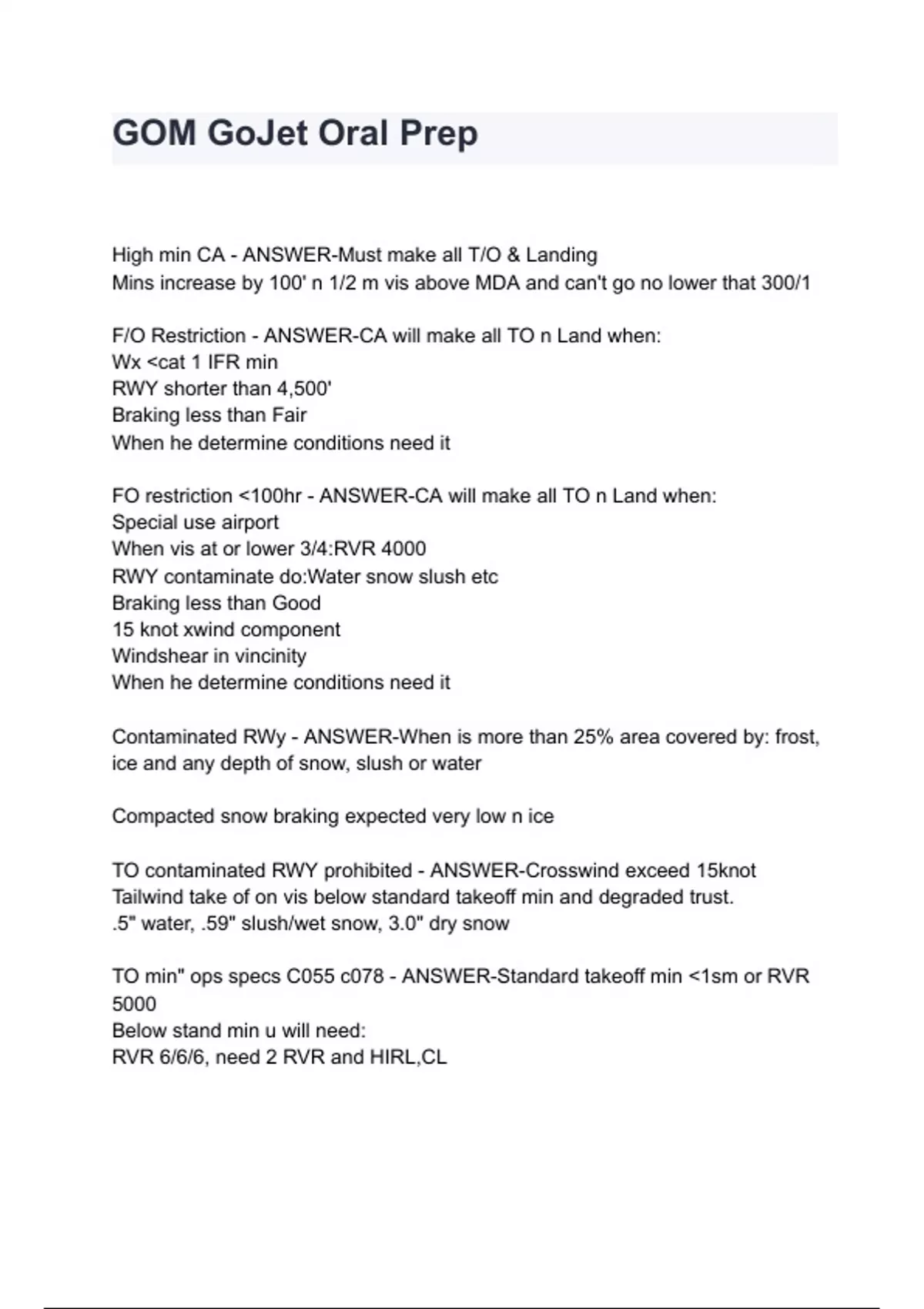 GOM GoJet Oral PrepHigh min CA - ANSWER-Must make all T/O & Landing Mins increase by 100' n 1/2 m vis above MDA and can't go no lower that 300/1 F/O Restriction - ANSWER-CA will make all TO n Land when: Wx cat 1 IFR min RWY shorter than 4,500' Braking less than Fair When he determine conditions need it FO restriction 100hr - ANSWER-CA will make all TO n Land when: Special use airport When vis at or lower 3/4:RVR 4000 RWY contaminate do:Water snow slush etc Braking less than Good 15 knot xwind component Windshear in vincinity When he determine conditions need it Contaminated RWy - ANSWER-When is more than 25% area covered by: frost, ice and any depth of snow, slush or water Compacted snow braking expected very low n ice TO contaminated RWY prohibited - ANSWER-Crosswind exceed 15knot Tailwind take of on vis below standard takeoff min and degraded trust. .5" water, .59" slush/wet snow, 3.0" dry snow TO min" ops specs C055 c078 - ANSWER-Standard takeoff min 1sm or RVR 5000 Below stand min u will need: RVR 6/6/6, need 2 RVR