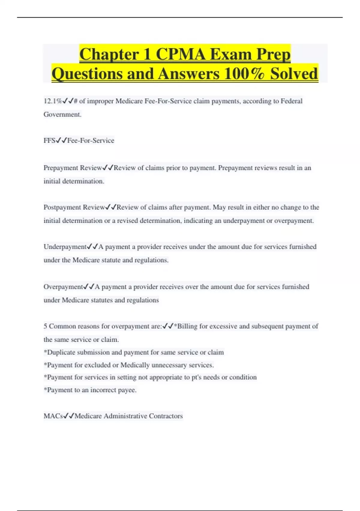 Chapter 1 CPMA Exam Prep Questions and Answers 100% Solved 12.1%# of improper Medicare Fee-For-Service claim payments, according to Federal Government. FFSFee-For-Service Prepayment ReviewReview of claims prior to payment. Prepayment reviews result in an initial determination. Postpayment ReviewReview of claims after payment. May result in either no change to the initial determination or a revised determination, indicating an underpayment or overpayment. UnderpaymentA payment a provider receives under the amount due for services furnished under the Medicare statute and regulations