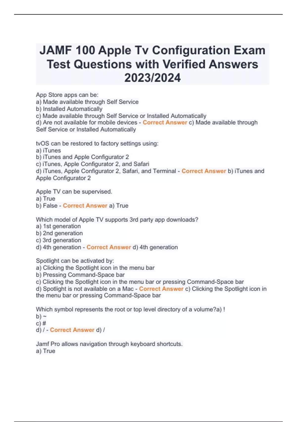 JAMF 100 Apple Tv Configuration Exam Test Questions with Verified Answers 2023/2024 App Store apps can be: a) Made available through Self Service b) Installed Automatically c) Made available through Self Service or Installed Automatically d) Are not available for mobile devices - Correct Answer c) Made available through Self Service or Installed Automatically tvOS can be restored to factory settings using: a) iTunes b) iTunes and Apple Configurator 2 c) iTunes, Apple Configurator 2, and Safari d) iTunes, Apple Configurator 2, Safari, and Terminal - Correct Answer b) iTunes and Apple Configurator 2 Apple TV can be supervised. a) True b) False - Correct Answer a) True Which model of Apple TV supports 3rd party app downloads? a) 1st generation b) 2nd generation c) 3rd generation d) 4th generation - Correct Answer d) 4th generation Spotlight can be activated by: a) Clicking the Spotlight icon in the menu bar b) Pressing Command-Space bar c) Clicking the Spotlight icon in the menu bar or pressing Command-Space bar d) Spotlight is not available on a Mac - Correct Answer c) Clicking the Spotlight icon in the menu bar or pressing Command-Space bar Which symbol represents the root or top level directory of a volume?a) ! b) ~ c) # d) / - Correct Answer d) / Jamf Pro allows navigation through keyboard shortcuts. a) True b) False - Correct Answer a) True Jamf Pro requires the following software: a) Java, Flash, MySQL b) Tomcat, Java, MySQL c) Flash, macOS, Windows d) Tomcat, Silverlight, MySQL - Correct Answer b) Tomcat, Java, MySQL Integrating GSX with Jamf Pro allows for purchasing and warranty information lookup. a) True b) False - Correct Answer a) True Which Jamf Pro application can be used to enroll a computer into Jamf Pro? a) Composer b) Apple Configurator 2 c) Recon d) Jamf Admin - Correct Answer c) Recon The Custom privilege set defaults to read only permissions for a Jamf Pro User Account. a) True b) False - Correct Answer b) False When scoping management tasks, what can be added to omit computers? a) Target b) None c) Limitation d) Exclusion - Correct Answer d) Exclusion What profile payload is not available for computers? a) Restrictions b) Lock Screen Message c) Mail d) Directory - Correct Answer b) Lock Screen Message Configuration profiles may be scoped to computers using: a) Buildings b) Buildings and departments c) Buildings, departments, and computer groups d) Buildings, departments, computer groups, and categories - Correct Answer c) Buildings, departments, and computer groups