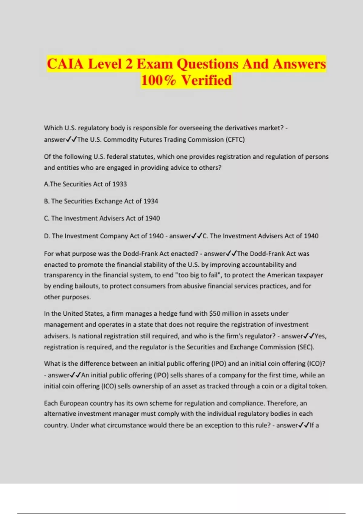 CAIA Level 2 Exam Questions And Answers 100% Verified Which U.S. regulatory body is responsible for overseeing the derivatives market? - answerThe U.S. Commodity Futures Trading Commission (CFTC) Of the following U.S. federal statutes, which one provides registration and regulation of persons and entities who are engaged in providing advice to others? A.The Securities Act of 1933 B. The Securities Exchange Act of 1934 C. The Investment Advisers Act of 1940 D. The Investment Company Act of 1940 - answerC. The Investment Advisers Act of 1940 For what purpose was the Dodd-Frank Act enacted? - answerThe Dodd-Frank Act was enacted to promote the financial stability of the U.S. by improving accountability and transparency in the financial system, to end "too big to fail", to protect the American taxpayer by ending bailouts, to protect consumers from abusive financial services practices, and for other purposes. In the United States, a firm manages a hedge fund with $50 million in assets under management and operates in a state that does not require the registration of investment advisers. Is national registration still required, and who is the firm's regulator? - answerYes, registration is required, and the regulator is the Securities and Exchange Commission (SEC). What is the difference between an initial public offering (IPO) and an initial coin offering (ICO)? - answerAn initial public offering (IPO) sells shares of a company for the first time, while an initial coin offering (ICO) sells ownership of an asset as tracked through a coin or a digital token. Each European country has its own scheme for regulation and compliance. Therefore, an alternative investment manager must comply with the individual regulatory bodies in each country. Under what circumstance would there be an exception to this rule? - answerIf a manager seeks to conduct business within the European Union, they are subject to a single regulatory scheme, as long as the manager is domiciled in one of its member states. What are the major differences between Undertakings for Collective Investments in Transferable Securities (UCITS) and Alternative Investment Funds (AIFs) in Europe? - answerThese are the following differences: 1. UCITS are generally for retail investors with small investment amounts while AIFs are for investors with higher investments 2. UCITS are restricted to safe and liquid assets while AIFs have fewer investment restrictions 3. UCITS limit leverage while AIFs can use reasonable levels of leverage Name the two methods available to fund managers to engage in the marketing of AIFs by AIFMs - answerThe two methods are as follows: 1. Using a marketing passport available under the AIFMD 2. Marketing in a specific EU member country in accordance with that country's private placement regime What is entailed within asset stripping rules and how long do the rules apply after acquiring control of a non-listed company? - answerAsset stripping rules prevent an AIF from making a controlling private equity investment, having the non-listed company take a loan, and then distributing the loan proceeds themselves. The rules are in effect for two years. Describe the duties of the Securities and Futures Ordinance (SFO) and the Securities and Futures Commission (SFC) in Hong Kong. - answerThe Securities and Futures Ordinance (SFO) is the primary legislation for the regulation of asset management activity in Hong Kong. The Securities and Futures Commission (SFC) is the regulator responsible for overseeing the SFO in Hong Kong. Under which three situations would a fund manager not be required to obtain a capital markets services (CMS) license in Singapore? - answerUnder the following three situations: 1. It carries on fund management in Singapore on behalf of not more than 30 qualified investors, (of which not more than 15 may be funds or limited partnerships). 2. The total value of the assets managed does not exceed a specific amount set out in the regulations. 3. It is registered with the Monetary Authority of Singapore (MAS) as a registered fund management company (RFMC). Describe the role of the Financial Supervisory Service (FSS) in South Korea. - answerThe Financial Supervisory Service (FSS) in South Korea is responsible for inspection of financial institutions as well as enforcement of relevant regulations as directed by the FSC. Describe the level of regulation for marketing of fund interests in Japan. - answerThe marketing of fund interests in Japan is heavily regulated. geopolitical beta - answeradds to the growth and inflation expectations in developing expected returns on various assets 1. What are some of the potential motivations for ESG adoption amongst institutional investors? - answerThe goals and motivations are as follows: A. Increasing risk-adjusted returns B. Reducing reputational risk C. Address stakeholder concerns D. Doing the right thing or improving the planet 2. List some of the challenges faced by institutional investors regarding ESG. - answerThe following are challen