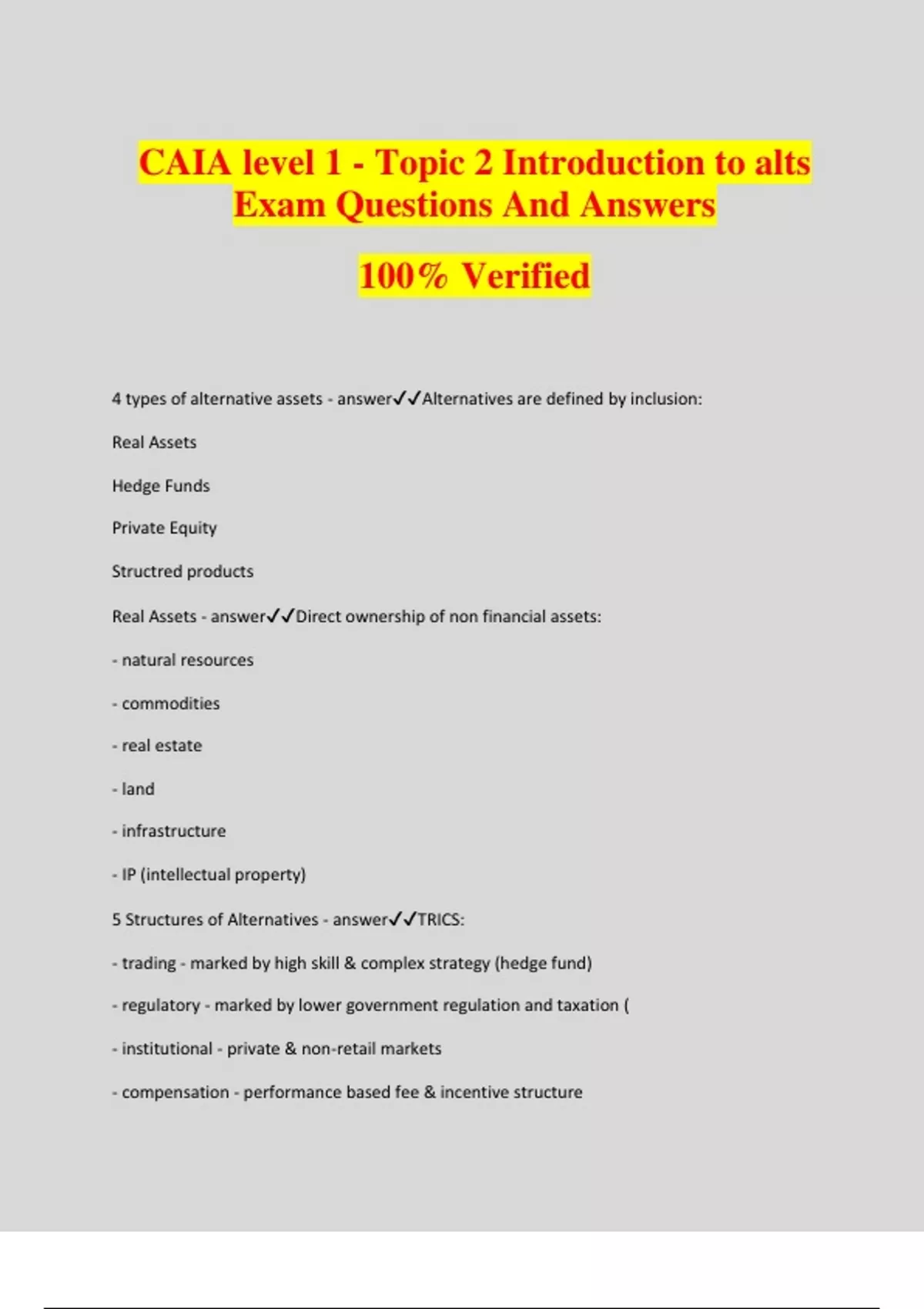 CAIA level 1 - Topic 2 Introduction to alts Exam Questions And Answers 100% Verified 4 types of alternative assets - answerAlternatives are defined by inclusion: Real Assets Hedge Funds Private Equity Structred products Real Assets - answerDirect ownership of non financial assets: - natural resources - commodities - real estate - land - infrastructure - IP (intellectual property) 5 Structures of Alternatives - answerTRICS: - trading - marked by high skill & complex strategy (hedge fund) - regulatory - marked by lower government regulation and taxation ( - institutional - private & non-retail markets - compensation - performance based fee & incentive structure - securities - unlike traditional equity & debt cash flow structure Structures of Real assets - answerInstitutional Securities Regulatory Compensation Hedge Funds - answerPrivately organized investment vehicles with little regulation - involved shorting, leverage or derivatives - includes managed future Private equity - answerEquity and debt positions which are not publicly traded - venture capital - LBOs - mezzanine debt - distressed debt Structured Products - answerInstruments created to exhibit particularly return, risk, taxation, or other attribute - include CDOs and credit derivatives Return characteristics of alternatives - answerNIDI Non-normality - do not follow bell curve (not easily modeled or predicted) Illiquidity - investment trades infrequently and/or with low volume; often nondivisible lumpy assets Diversifiers - low correlation with traditional assets; absolute return products Inefficiency - market prices do not reflect all available information; may lead to superior risk- adjusted performance Methods of analysis - answerRSVP