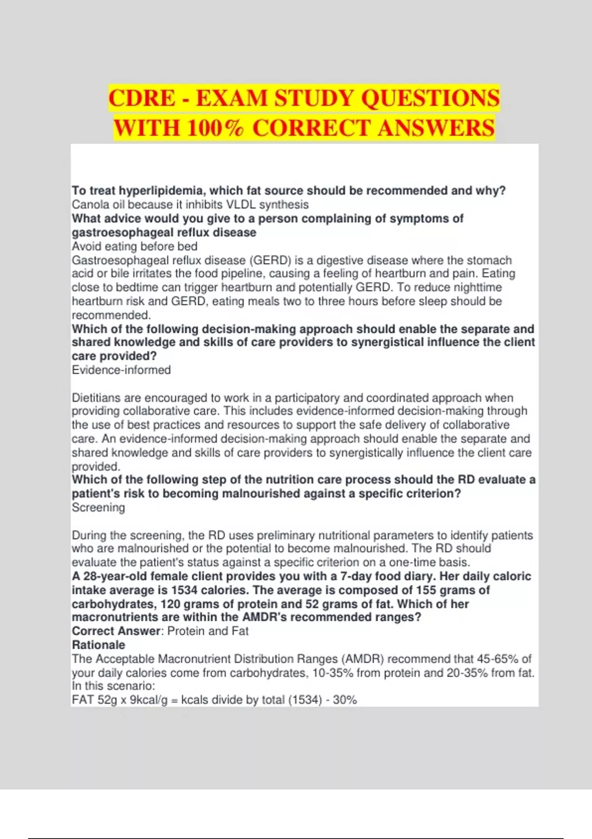 CDRE - EXAM STUDY QUESTIONS WITH 100% CORRECT ANSWERS To treat hyperlipidemia, which fat source should be recommended and why? Canola oil because it inhibits VLDL synthesis What advice would you give to a person complaining of symptoms of gastroesophageal reflux disease Avoid eating before bed Gastroesophageal reflux disease (GERD) is a digestive disease where the stomach acid or bile irritates the food pipeline, causing a feeling of heartburn and pain. Eating close to bedtime can trigger heartburn and potentially GERD. To reduce nighttime heartburn risk and GERD, eating meals two to three hours before sleep should be recommended. Which of the following decision-making approach should enable the separate and shared knowledge and skills of care providers to synergistical influence the client care provided? Evidence-informed Dietitians are encouraged to work in a participatory and coordinated approach when providing collaborative care. This includes evidence-informed decision-making through the use of best practices and resources to support the safe delivery of collaborative care. An evidence-informed decision-making approach should enable the separate and shared knowledge and skills of care providers to synergistically influence the client care provided. Which of the following step of the nutrition care process should the RD evaluate a patient's risk to becoming malnourished against a specific criterion? Screening During the screening, the RD uses preliminary nutritional parameters to identify patients who are malnourished or the potential to become malnourished. The RD should evaluate the patient's status against a specific criterion on a one-time basis. A 28-year-old female client provides you with a 7-day food diary. Her daily caloric intake average is 1534 calories. The average is composed of 155 grams of carbohydrates, 120 grams of protein and 52 grams of fat. Which of her macronutrients are within the AMDR's recommended ranges? Correct Answer: Protein and Fat Rationale The Acceptable Macronutrient Distribution Ranges (AMDR) recommend that 45-65% of your daily calories come from carbohydrates, 10-35% from protein and 20-35% from fat. In this scenario: FAT 52g x 9kcal/g = kcals divide by total (1534) - 30% PROTEIN 120g x 4kcal/g = kcal divide by total - 31% CARBS 155 g x 4kcal/g = kcal divide by total - 40% A RD is working with a 3-year-old female patient with Cystic Fibrosis (CF). During her consultation, you notice that your patient's hair is dry, dull and lacks shine. What is the possible nutritional-related cause of this? EFA deficiency Essential fatty acid deficiency (EFAD) is a sign of protein-energy deficiency. EFAD has been known to occur in CF patients. This deficiency is evident if the patient's hair is dry, dull, lacks shine and can be easily plucked. Julia, a 19-year-old girl who has a BMI of 15.5 and is very active. She is referred to the dietitian because she refuses to consume milk products believing they cause weight gain. Correct Answer: Determine why she is concerned about weight gain Rationale Before making any recommendations about food intake, the dietitian needs to understand the client’s beliefs about weight gain. Julia opens up with the Dietitian about her eating habits and her active life as a gymnast. She expresses a fear of gaining weight and decided to significantly decrease her caloric intake in the days leading up to competition. What eating disorder is Julia most likely experiencing? Anorexia Nervosa What is not related to anorexia nervosa? Anorexic patients may have episodes of binge eating, followed by purging Julia returns two weeks later and tells the dietitian she is currently restricting her diet to 850 calories per day. She also mentions she feeling weak and dizzy today. Which of the following actions should the RD take? Obtain the client's consent to contact the physician The statement "All food service employees must wash their hands before returning to work" is an example of a: Policy A registered dietitian should remove dietary restrictions for which of following patient's diet? Patient's food intake is less than 50% for 72 hours and complains of poor appetite For patients with a poor appetite, overly restrictive diets may limit food choices or provide unfamiliar/unpalatable food items. These practices may result in inadequate food and nutrient intake. By removing dietary restrictions, the patient may eat more food as a result of increase food selections. A registered dietitian that asked himself "will this action compromise my objectivity?". Which type of conflict of interest test is this RD demonstrating? Situational Judgment Test Situational judgement tests tend to determine behavioural tendencies, assessing how a RD will behave in a certain situation, and knowledge potential actions, which evaluates the effectiveness of possible responses. This technology improves safety and extends the shelf life of foods by reducing or eliminating microorganisms and insects by using ionizing radiation to food: Food irradiation When baking at high altitudes, atmospheric pressure is reduced and there are necessary adjustments that need to be made to correct for this. What needs to be adjusted when baking at high altitudes? Decrease baking powder and increase liquid There is an inverse relationship between altitude and pressure (high altitude, low pressure vs. low altitude, high pressure). Cooking in these environmentals requires alterations. Boiling point at high altitudes is decreased and cooking time is decreased, hence, food takes longer to cook. The goal of nutritional education includes enhancing one's knowledge of creating positive attitudes about healthy eating, importance of food, and other lifestyle factors that can prevent common nutrition-related problems. This type of education is most appropriate for which age group? Adolescents During a nutrition-focused physical exam on a 80-year-old male patient, a registered dietitian (RD) closely examin