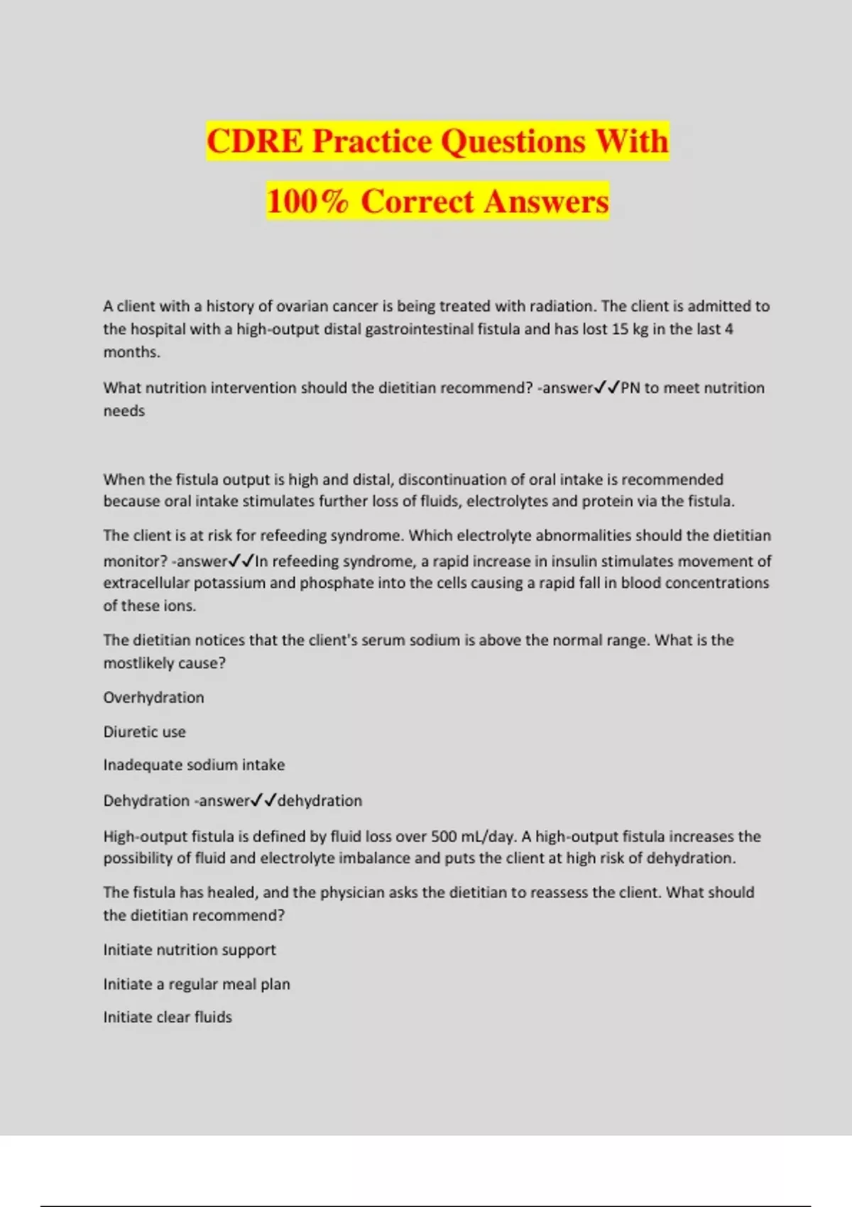 CDRE Practice Questions With 100% Correct Answers A client with a history of ovarian cancer is being treated with radiation. The client is admitted to the hospital with a high-output distal gastrointestinal fistula and has lost 15 kg in the last 4 months. What nutrition intervention should the dietitian recommend? -answerPN to meet nutrition needs When the fistula output is high and distal, discontinuation of oral intake is recommended because oral intake stimulates further loss of fluids, electrolytes and protein via the fistula. The client is at risk for refeeding syndrome. Which electrolyte abnormalities should the dietitian monitor? -answerIn refeeding syndrome, a rapid increase in insulin stimulates movement of extracellular potassium and phosphate into the cells causing a rapid fall in blood concentrations of these ions. The dietitian notices that the client's serum sodium is above the normal range. What is the mostlikely cause? Overhydration Diuretic use Inadequate sodium intake Dehydration -answerdehydration High-output fistula is defined by fluid loss over 500 mL/day. A high-output fistula increases the possibility of fluid and electrolyte imbalance and puts the client at high risk of dehydration. The fistula has healed, and the physician asks the dietitian to reassess the client. What should the dietitian recommend? Initiate nutrition support Initiate a regular meal plan Initiate clear fluids Initiate a low-fibre meal plan -answerCF Oral feeding should be initiated as soon as the gastrointestinal tract is functional. Dilute liquids are taken first and then, as the bowel adapts, the patient begins the slow return to a regular diet. The client is now on a regular meal plan and the dietitian wants to determine if nutrition needs are being met. What method would the dietitian use to get an estimate of the client's usual intake? Obtain a 3-day food intake record Observe the client at mealtime Complete a 24-hr food recall Request nursing for comments on the client's intake -answer3 day food record A 3-day food record would provide the best picture of usual intake as it allows the dietitian to average intake over a 3-day period. observation : This will provide information only for the observed meals, not total food intake. A 24-hr recall provides no information about day-to-day variation of food intake. Information from nursing can be subject to interpretation depending on the person. Also, often the rotation of nursing staff can change every 8-12 hours and from day to day so observations may not be consistent. A patient is admitted to hospital for shortness of breath, nausea, vomiting and ascites. The patient reports a recent rapid weight gain of 7 kg (height: 160 cm, current weight: 67 kg). Upon admission, lab data reveal a low serum albumin and normal liver function tests. The patient's diet provides about 6,800 kJ (1,600 kcal) and 60 g protein. Which conclusion should the dietitian make based on this information? Weight gain is a positive indicator of improved nutrition status Recent weight gain reflects an increased oral intake Serum albumin is low due to the intake of a low-protein diet Recent weight gain is related to low serum albumin -answerRapid and significant weight gain is most likely due to a shift in fluid balance. This is supported by the low albumin level, which can result in edema, confirmed by theclient's ascites. A client is referred to the dietitian for an initial visit about their lactose intolerance. The referral form indicates that the client is apprehensive and reluctant to discuss their symptoms. Which action would be most effective when counselling the client? Ask the client questions to assess verbal and non-verbal responses Ask the client to record and email their symptoms before their next appointment Provide the client with a list of lactose-free products Outline the dietary changes the client will have to make -answerassess vernal and nonverbal cues Drawing client out puts them at ease and establishes rapport. Non-verbal communication is a reliable indicator of client apprehension An objective of a high school nutrition program