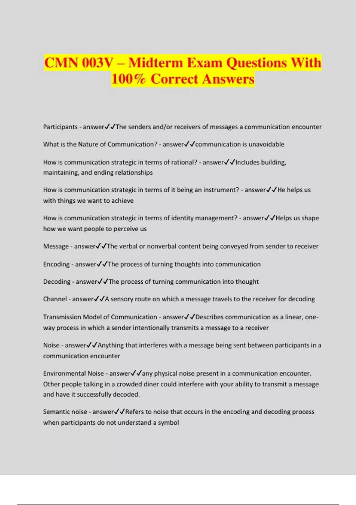 CMN 003V – Midterm Exam Questions With 100% Correct Answers Participants - answerThe senders and/or receivers of messages a communication encounter What is the Nature of Communication? - answercommunication is unavoidable How is communication strategic in terms of rational? - answerIncludes building, maintaining, and ending relationships How is communication strategic in terms of it being an instrument? - answerHe helps us with things we want to achieve How is communication strategic in terms of identity management? - answerHelps us shape how we want people to perceive us Message - answerThe verbal or nonverbal content being conveyed from sender to receiver Encoding - answerThe process of turning thoughts into communication Decoding - answerThe process of turning communication into thought Channel - answerA sensory route on which a message travels to the receiver for decoding Transmission Model of Communication - answerDescribes communication as a linear, one- way process in which a sender intentionally transmits a message to a receiver Noise - answerAnything that interferes with a message being sent between participants in a communication encounter Environmental Noise - answerany physical noise present in a communication encounter. Other people talking in a crowded diner could interfere with your ability to transmit a message and have it successfully decoded. Semantic noise - answerRefers to noise that occurs in the encoding and decoding process when participants do not understand a symbol Interaction Model of Communication - answerDescribes communication as a process in which participants alternate positions as sender and receiver and generate meaning by sending messages and receiving feedback within physical and psychological Feedback - answerIncludes message sent in response to other messages Physical Context - answerIncludes the environmental factors in a communication encounter. The size, layout, temperature, and lighting of a space influence our communication The transmission model - answerViews communication as a thing, like an information packet, that is sent and then followed by a reaction, which is then followed by another reaction The interaction model - answerViews communication as an interaction in which a message is sent and then followed by a reaction (feedback), which is then followed by another reaction Transaction Model of Communication - answerDescribes communication as a process in which communicators generate social realities within social, relational, and cultural contexts Cultural Context - answerIncludes various aspects of identities such as race, gender, nationality, ethnicity, sexual orientation, class, and ability Relational Context - answerIncludes the previous interpersonal history and type of relationship we have with a person Social Context - answerRefers to the stated rules or understated norms that guide communication unconscious incompetence - answerwhich means you are not even aware that you are communication in an incompetent man