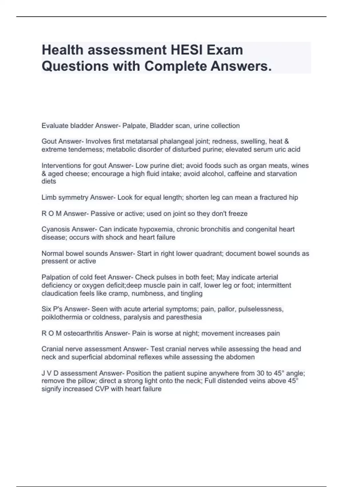 Health assessment HESI Exam Questions with Complete Answers
