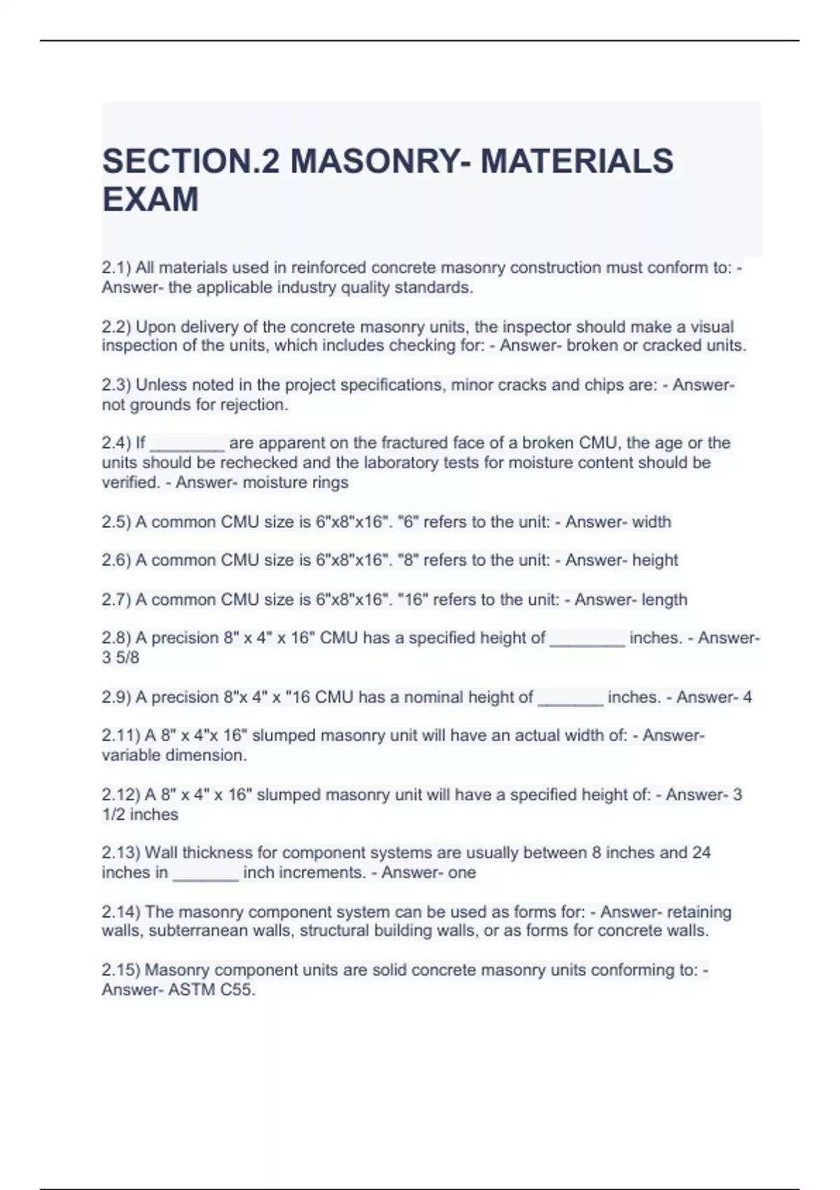 SECTION.2 MASONRY- MATERIALS EXAM