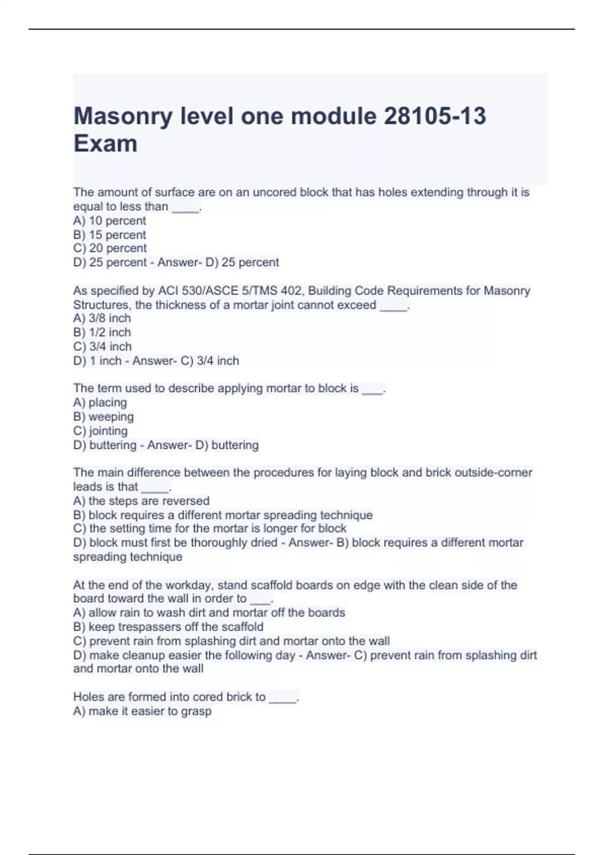 Masonry level one module 28105-13 Exam with 100% correct Answers
