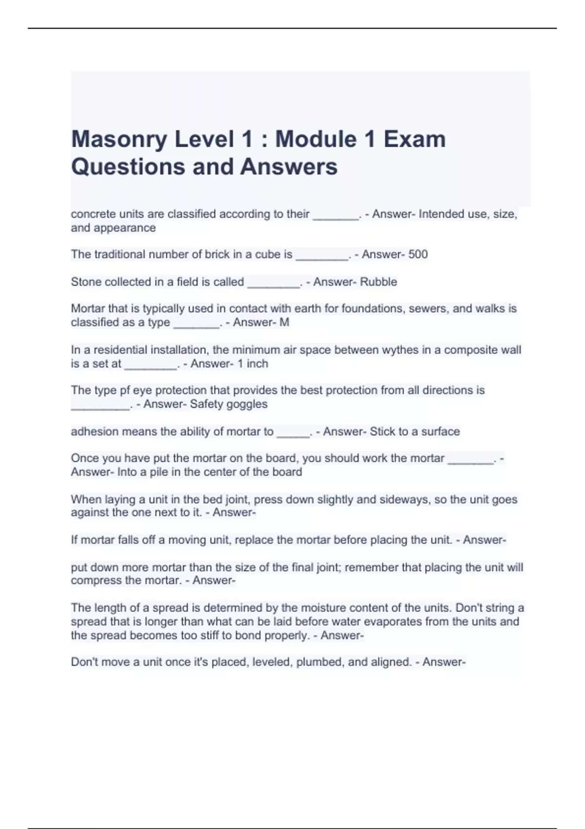 Masonry Level 1 Module 1 Exam Questions and Answers