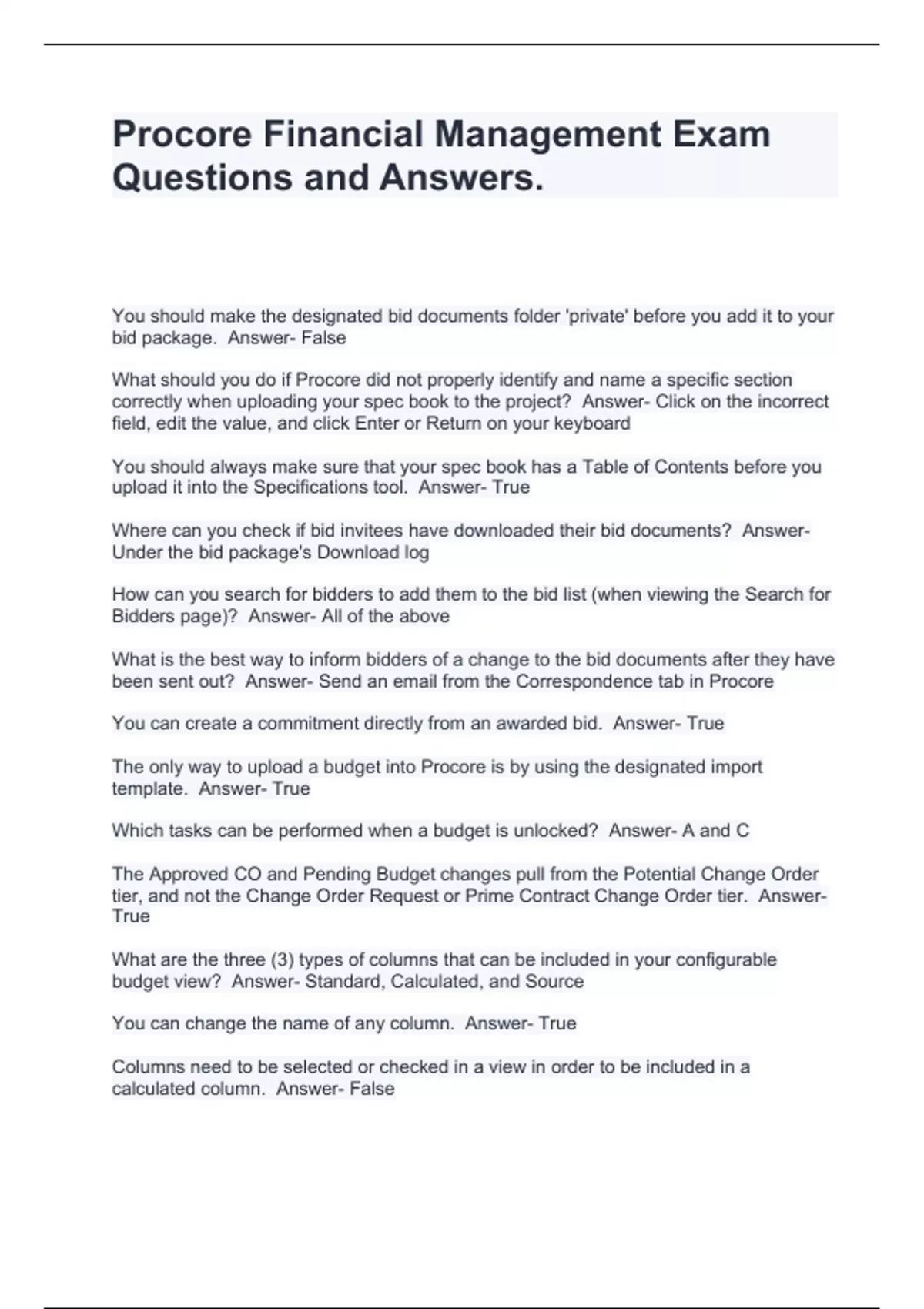 Procore Financial Management Exam Questions and Answers