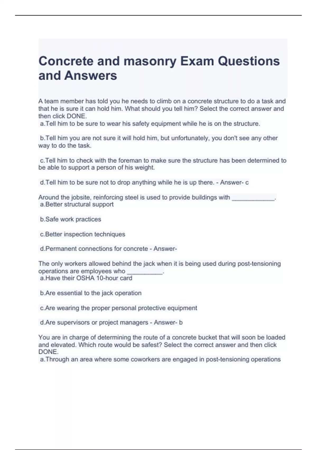 Concrete and masonry Exam Questions and Answers