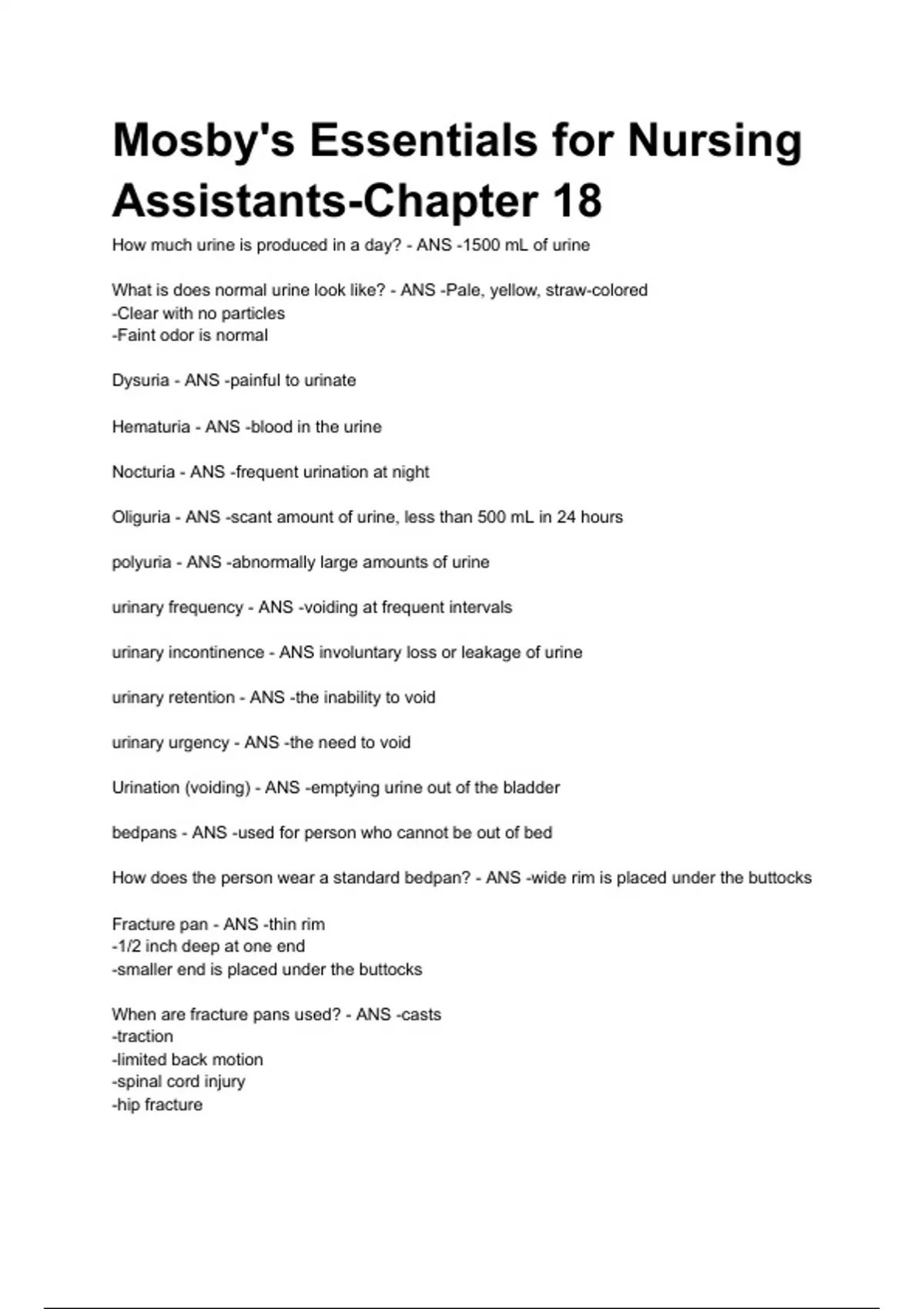 Mosby's Essentials for Nursing Assistants-Chapter 18 EXAM QUESTIONS AND ANSWERS 100% VERIFIED How much urine is produced in a day? - ANS -1500 mL of urine What is does normal urine look like? - ANS -Pale, yellow, straw-colored -Clear with no particles -Faint odor is normal Dysuria - ANS -painful to urinate Hematuria - ANS -blood in the urine Nocturia - ANS -frequent urination at night Oliguria - ANS -scant amount of urine, less than 500 mL in 24 hours polyuria - ANS -abnormally large amounts of urine urinary frequency - ANS -voiding at frequent intervals urinary incontinence - ANS involuntary loss or leakage of urine urinary retention - ANS -the inability to void urinary urgency - ANS -the need to void Urination (voiding) - ANS -emptying urine out of the bladder bedpans - ANS -used for person who cannot be out of bed How does the person wear a standard bedpan? - ANS -wide rim is placed under the buttocks Fracture pan - ANS -thin rim -1/2 inch deep at one end -smaller end is placed under the buttocks When are fracture pans used? - ANS -casts -traction -limited back motion -spinal cord injury -hip fracture urinal - ANS -men use urinals to void -hooks to the bed rail within the man's reach -sits on the side of the bed or stands if possible Where should you not place urinals? - ANS -do not place urinals on the over-bed table and bedside stands When should you empty urinals? - ANS -promptly, as soon as you can commode - ANS -chair or wheelchair with an opening for a container -unable to walk to the bathroom often us