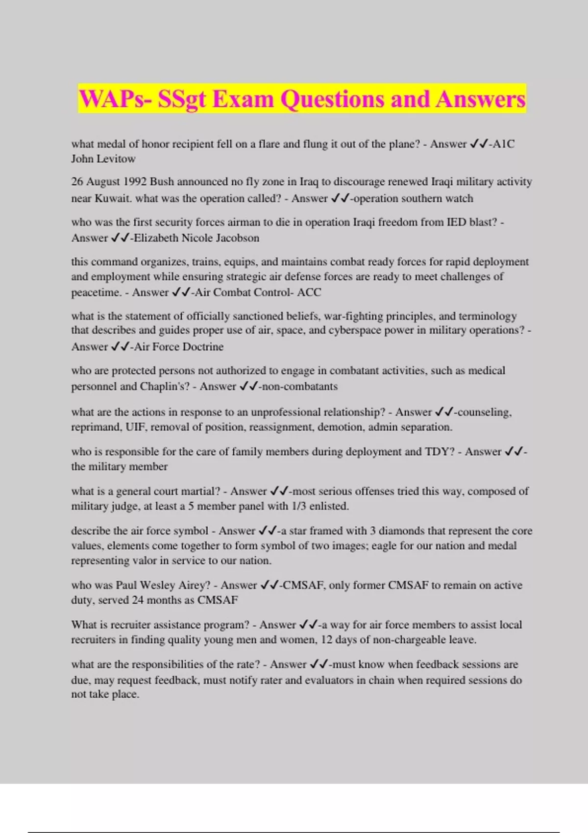 WAPs- SSgt Exam Questions and Answers what medal of honor recipient fell on a flare and flung it out of the plane? - Answer ️️ -A1C John Levitow 26 August 1992 Bush announced no fly zone in Iraq to discourage renewed Iraqi military activity near Kuwait. what was the operation called? - Answer ️️ -operation southern watch who was the first security forces airman to die in operation Iraqi freedom from IED blast? - Answer ️️ -Elizabeth Nicole Jacobson this command organizes, trains, equips, and maintains combat ready forces for rapid deployment and employment while ensuring strategic air defense forces are ready to meet challenges of peacetime. - Answer ️️ -Air Combat Control- ACC what is the statement of officially sanctioned beliefs, war-fighting principles, and terminology that describes and guides proper use of air, space, and cyberspace power in military operations? - Answer ️️ -Air Force Doctrine who are protected persons not authorized to engage in combatant activities, such as medical personnel and Chaplin's? - Answer ️️ -non-combatants what are the actions in response to an unprofessional relationship? - Answer ️️ -counseling, reprimand, UIF, removal of position, reassignment, demotion, admin separation. who is responsible for the care of family members during deployment and TDY? - Answer ️️ - the military member what is a general court martial? - Answer ️️ -most serious offenses tried this way, composed of military judge, at least a 5 member panel with 1/3 enlisted. describe the air force symbol - Answer ️️ -a star framed with 3 diamonds that represent the core values, elements come together to form symbol of two images; eagle for our nation and medal representing valor in service to our nation. who was Paul Wesley Airey? - Answer ️️ -CMSAF, only former CMSAF to remain on active duty, served 24 months as CMSAF What is recruiter assistance program? - Answer ️️ -a way for air force members to assist local recruiters in finding quality young men and women, 12 days of non-chargeable leave. what are the responsibilities of the rate? - Answer ️️ -must know when feedback sessions are due, may request feedback, must notify rater and evaluators in chain when required sessions do not take place.