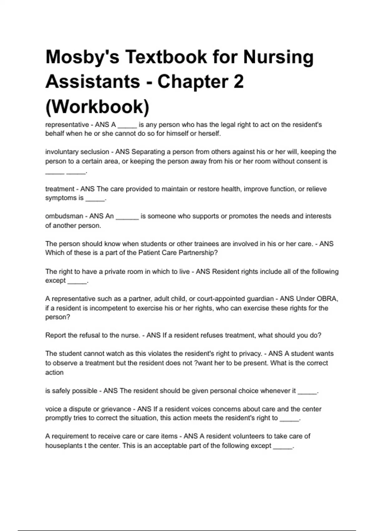 Mosby's Textbook for Nursing Assistants - Chapter 2 VERIFIED representative - ANS A _____ is any person who has the legal right to act on the resident's behalf when he or she cannot do so for himself or herself. involuntary seclusion - ANS Separating a person from others against his or her will, keeping the person to a certain area, or keeping the person away from his or her room without consent is _____ _____. treatment - ANS The care provided to maintain or restore health, improve function, or relieve symptoms is _____. ombudsman - ANS An ______ is someone who supports or promotes the needs and interests of another person. The person should know when students or other trainees are involved in his or her care. - ANS Which of these is a part of the Patient Care Partnership? The right to have a private room in which to live - ANS Resident rights include all of the following except _____. A representative such as a partner, adult child, or court-appointed guardian - ANS Under OBRA, if a resident is incompetent to exercise his or her rights, who can exercise these rights for the person? Report the refusal to the nurse. - ANS If a resident refuses treatment, what should you do? The student cannot watch as this violates the resident's right to privacy. - ANS A student wants to observe a treatment but the resident does not ?want her to be present. What is the correct action is safely possible - ANS The resident should be given personal choice whenever it _____. voice a dispute o