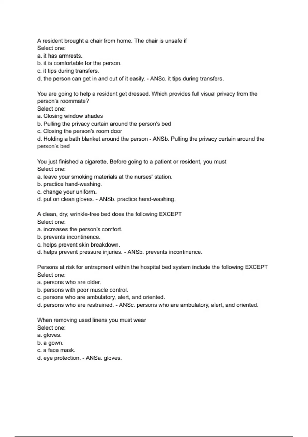 Mosby's Essentials for Nursing Assistants Ch. 17 Review RATED A+ Which bed position means the head of the bed is raised 30 degrees? Select one: a. The flat position b. Trendelenburg's position c. The highest horizontal position d. Semi-Fowler's position - ANSd. Semi-Fowler's position A resident has dementia. The person cannot explain when there is pain or where the pain is. Which is correct? Select one: a. The person's family will tell you when the person has pain. b. Behavior changes may signal pain. c. Pain will cause the person to scream. d. Pain is not a concern. Persons with dementia cannot feel pain. - ANSb. Behavior changes may signal pain. A drawsheet is placed Select one: a. on the mattress pad. b. over the blanket. c. over the bottom sheet. d. on the pillow. - ANSc. over the bottom sheet. The person's area of the room, or