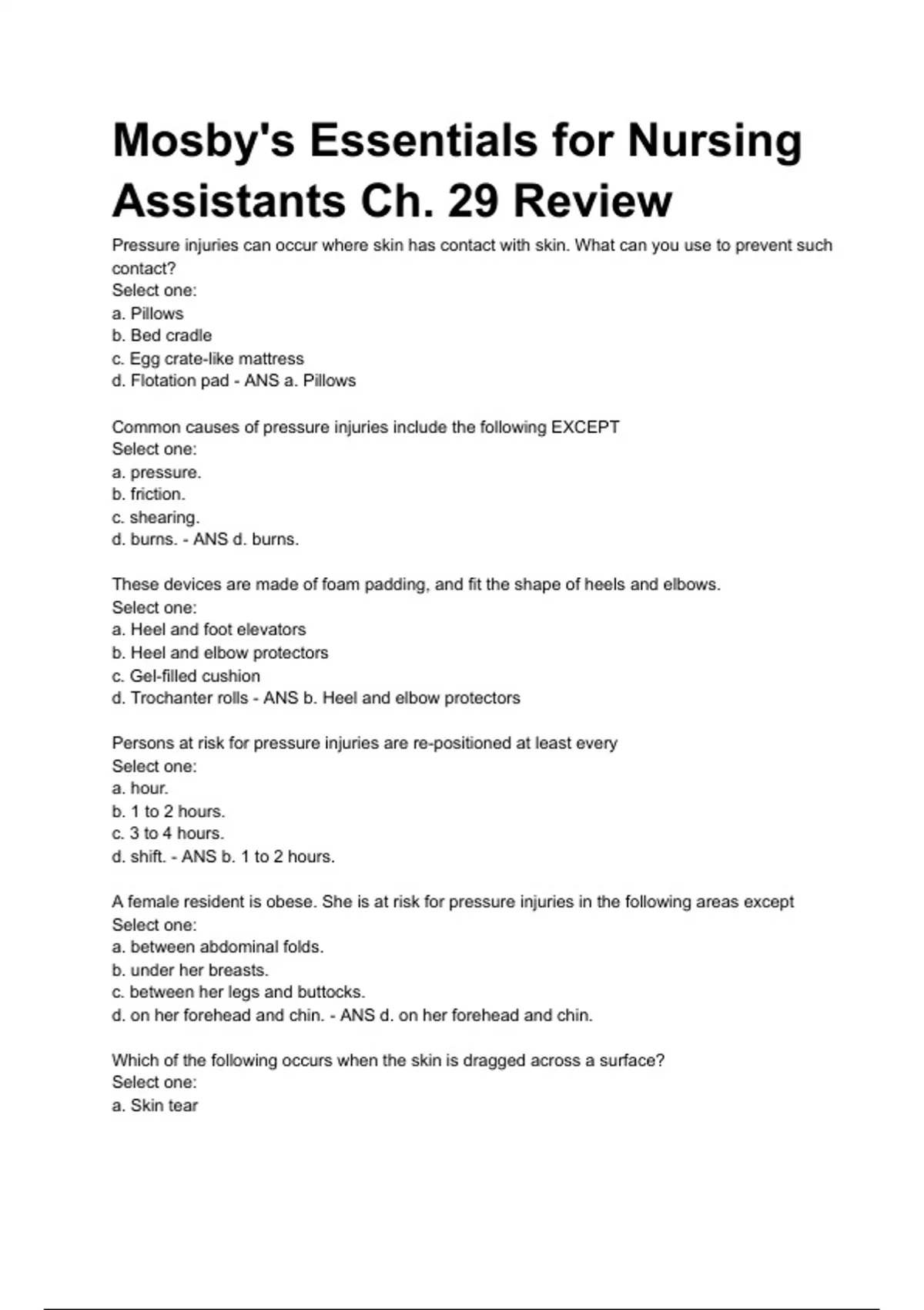 Mosby's Essentials for Nursing Assistants Ch. 29 Review RATED A+ ressure injuries can occur where skin has contact with skin. What can you use to prevent such contact? Select one: a. Pillows b. Bed cradle c. Egg crate-like mattress d. Flotation pad - ANS a. Pillows Common causes of pressure injuries include the following EXCEPT Select one: a. pressure. b. friction. c. shearing. d. burns. - ANS d. burns. These devices are made of foam padding, and fit the shape of heels and elbows. Select one: a. Heel and foot elevators b. Heel and elbow protectors c. Gel-filled cushion d. Trochanter rolls - ANS b. Heel and elbow protectors Persons at risk for pressure injuries are re-positioned at least every Select one: a. hour. b. 1 to 2 hours. c. 3 to 4 hours. d. shift. - ANS b. 1 to 2 hours. A female resident is obese. She is at risk for pressure injuries in the following areas except Select one: a. between abdominal folds. b. under her breasts.