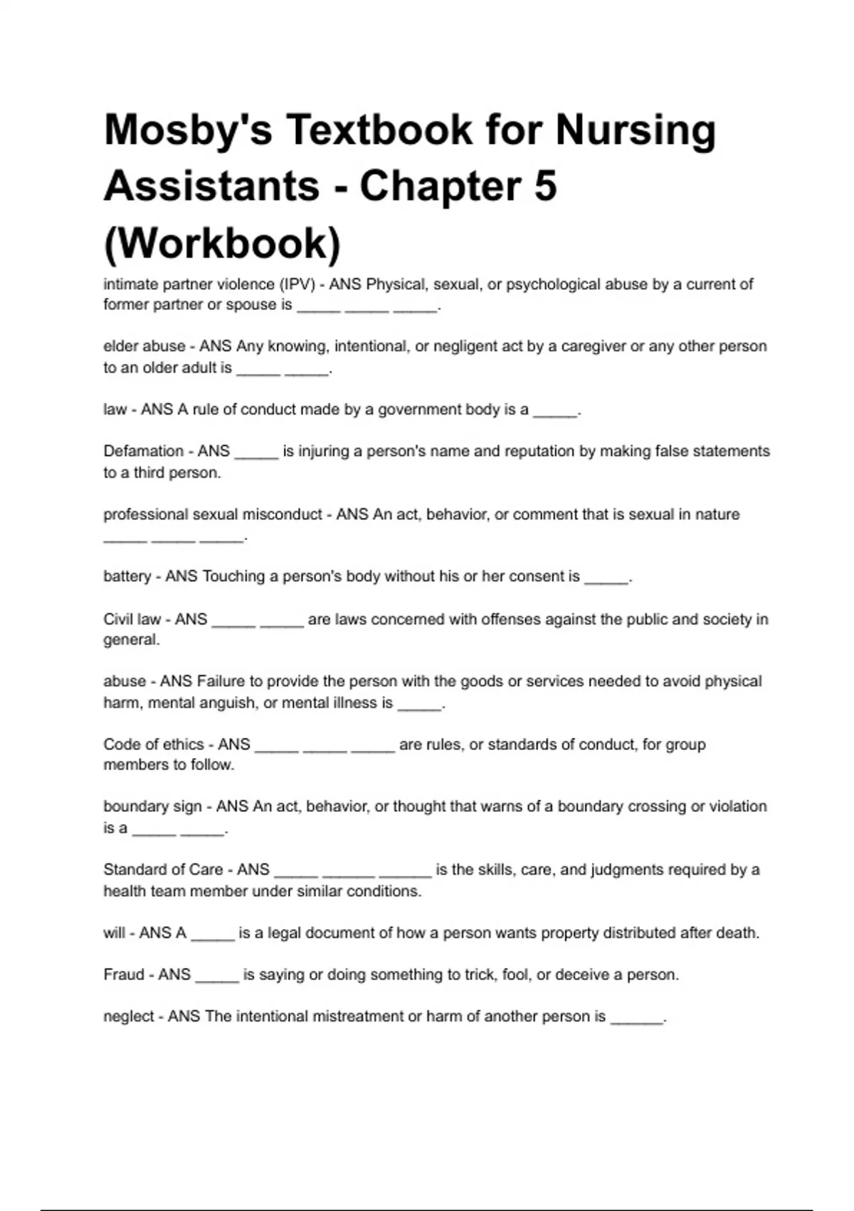 Mosby's Textbook for Nursing Assistants - Chapter 5 VERIFIED intimate partner violence (IPV) - ANS Physical, sexual, or psychological abuse by a current of former partner or spouse is _____ _____ _____. elder abuse - ANS Any knowing, intentional, or negligent act by a caregiver or any other person to an older adult is _____ _____. law - ANS A rule of conduct made by a government body is a _____. Defamation - ANS _____ is injuring a person's name and reputation by making false statements to a third person. professional sexual misconduct - ANS An act, behavior, or comment that is sexual in nature _____ _____ _____. battery - ANS Touching a person's body without his or her consent is _____. Civil law - ANS _____ _____ are laws concerned with offenses against the public and society in general. abuse - ANS Failure to provide the person with the goods or services needed to avoid physical harm, mental anguish, or mental illness is _____. Code of ethics - ANS _____ _____ _____ are rules, or standards of conduct, for group members to follow. boundary sign - ANS An act, behavior, or thought that warns of a boundary crossing or violation is a _____ _____.