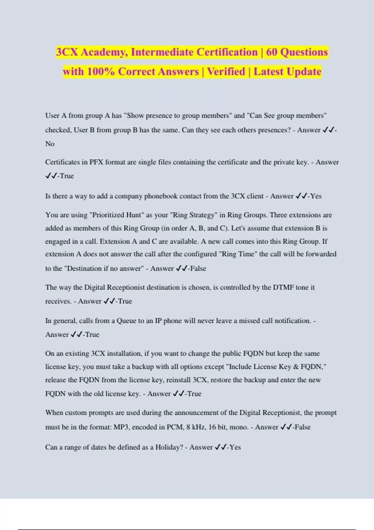 3CX Academy, Intermediate Certification | 60 Questions with 100% Correct Answers | Verified | Latest Update User A from group A has "Show presence to group members" and "Can See group members" checked, User B from group B has the same. Can they see each others presences? - Answer ️️ - No Certificates in PFX format are single files containing the certificate and the private key. - Answer ️️ -True Is there a way to add a company phonebook contact from the 3CX client - Answer ️️ -Yes You are using "Prioritized Hunt" as your "Ring Strategy" in Ring Groups. Three extensions are added as members of this Ring Group (in order A, B, and C). Let's assume that extension B is engaged in a call. Extension A and C are available. A new call comes into this Ring Group. If extension A does not answer the call after the configured "Ring Time" the call will be forwarded to the "Destination if no answer" - Answer ️️ -False The way the Digital Receptionist destination is chosen, is controlled by the DTMF tone it receives. - Answer ️️ -True In general, calls from a Queue to an IP phone will never leave a missed call notification. - Answer ️️ -True On an existing 3CX installation, if you want to change the public FQDN but keep the same license key, you must take a backup with all options except "Include License Key & FQDN," release the FQDN from the license key, reinstall 3CX, restore the backup and enter the new FQDN with the old license key. - Answer ️️ -True When custom prompts are used during the announcement of the Digital Receptionist, the prompt must be in the format: MP3, encoded in PCM, 8 kHz, 16 bit, mono. - Answer ️️ -False Can a range of dates be defined as a Holiday? - Answer ️️ -Yes All extensions are added to the "DEFAULT" group (which can be renamed) upon creation. - Answer ️️ -True STUN is a method enabling deskphones to discover their public IP address and port mapping of their internal SIP port. - Answer ️️ -True In order to upgrade from V14 latest Service Pack to V15, the correct procedure is: Full Backup of V14 - Uninstall V14 - Install V15 - during the installation restore V14 backup - finish the V15 installation. - Answer ️️ -True Extension 100 is an agent of the two Queues. 3CX is licensed with a "Standard Edition" license. Can extension 100, by any means, only log out from Queue A as an active agent but not from Queue B? - Answer ️️ -No The default backup folder set during the installation in Windows is C:ProgramData3CXInstance1DataBackups. If you uninstall 3CX, is this folder deleted without warning along with all its contents? - Answer ️️ -Yes An extension is part of a ring group. This extension has switched its profile to DnD and has been configured to redirect all calls to the extension, to voice mail. Will all calls to the ring group also be redirected to the voicemail of the user? - Answer ️️ -False (No) If you choose to use your own public FQDN during the 3CX installation, can you use a wildcard certificate, if it covers the FQDN you want to use? - Answer ️️ -Yes As the 3CX SBC can help overcome NAT issues no NAT is required at all, neither at the remote location where the SBC is located nor on the firewall in front of 3CX. - Answer ️️ -True Chat messages across the users of a group can be blocked by unticking the right "Can Chat with group members." - Answer ️️ -False Voice mailbox greetings can be different based on the user's profile status. - Answer ️️ -True A caller connected to a Digital Receptionist can directly dial the extension number of a user and will directly be transferred to that extension. - Answer ️️ -True