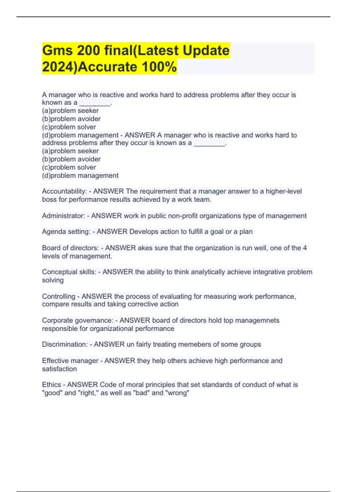Gms 200 final(Latest Update 2024)AccuraA manager who is reactive and works hard to address problems after they occur is known as a ________. (a)problem seeker (b)problem avoider (c)problem solver (d)problem management - ANSWER A manager who is reactive and works hard to address problems after they occur is known as a ________. (a)problem seeker (b)problem avoider (c)problem solver (d)problem management Accountability: - ANSWER The requirement that a manager answer to a higher-level boss for performance results achieved by a work team. Administrator: - ANSWER work in public non-profit organizations type of management Agenda setting: - ANSWER Develops action to fulfill a goal or a plan Board of directors: - ANSWER akes sure that the organization is run well, one of the 4 levels of management. Conceptual skills: - ANSWER the ability to think analytically achieve integrative problem solving Controlling - ANSWER the process of evaluating for measuring work performance, compare results and taking corrective action Corporate governance: - ANSWER board of directors hold top managemnets responsible for organizational performance Discrimination: - ANSWER un fairly treating memebers of some groups Effective manager - ANSWER they help others achieve high performance and satisfaction Ethics - ANSWER Code of moral principles that set standards of conduct of what is "good" and "right,'' as well as "bad" and "wrong" Freeagent economy : - ANSWER people change jobs more often and work on flexible schedules Functional managers : - ANSWER responsible for every single area of activity. Types of management General managers: - ANSWER responsible for more complex units that include many functional areas. part of Types of management Glass ceiling effect - ANSWER an invisible barrier an organization Globalization - ANSWER the worldwide interdependence of resources flows, product markets, and business competition that characterize our economy. Human skill - ANSWER the ability to work well in cooperation with other persons. Job migration - ANSWER occurs when firms shift from one country to another leading - ANSWER the process of arousing people to enthusiasm and inspiring them to work . Learning - ANSWER the change of behaviour based on past experiences Lifelong learning - ANSWER the process of continuous learning. Line managers - ANSWER are responsible for work activities that directly affect the organization outputs. It is part of the five types of management. Management process - ANSWER planning, organizing, leading, controlling Manager - ANSWER directly supports, supervises and helps activate the work efforts of others. middle managers - ANSWER encharged to oversee large departments or divisions. Networking: - ANSWER process of building and maintaining positive relationships with people who can help advance agendas. Open system - ANSWER organizations with open systems interact with their environments. Organization - ANSWER A group of people who work together to achieve some specific purpose Organizing - ANSWER arranging tasks, people, and other resources to accomplish the work te 100%