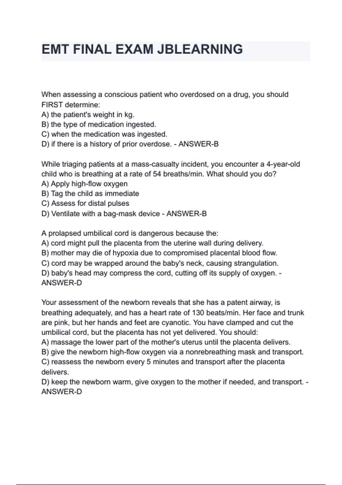 When assessing a conscious patient who overdosed on a drug, you should FIRST determine: A) the patient's weight in kg. B) the type of medication ingested. C) when the medication was ingested. D) if there is a history of prior overdose. - ANSWER-B While triaging patients at a mass-casualty incident, you encounter a 4-year-old child who is breathing at a rate of 54 breaths/min. What should you do? A) Apply high-flow oxygen B) Tag the child as immediate C) Assess for distal pulses D) Ventilate with a bag-mask device - ANSWER-B A prolapsed umbilical cord is dangerous because the: A) cord might pull the placenta from the uterine wall during delivery. B) mother may die of hypoxia due to compromised placental blood flow. C) cord may be wrapped around the baby's neck, causing strangulation. D) baby's head may compress the cord, cutting off its supply of oxygen. - ANSWER-D Your assessment of the newborn reveals that she has a patent airway, is brea